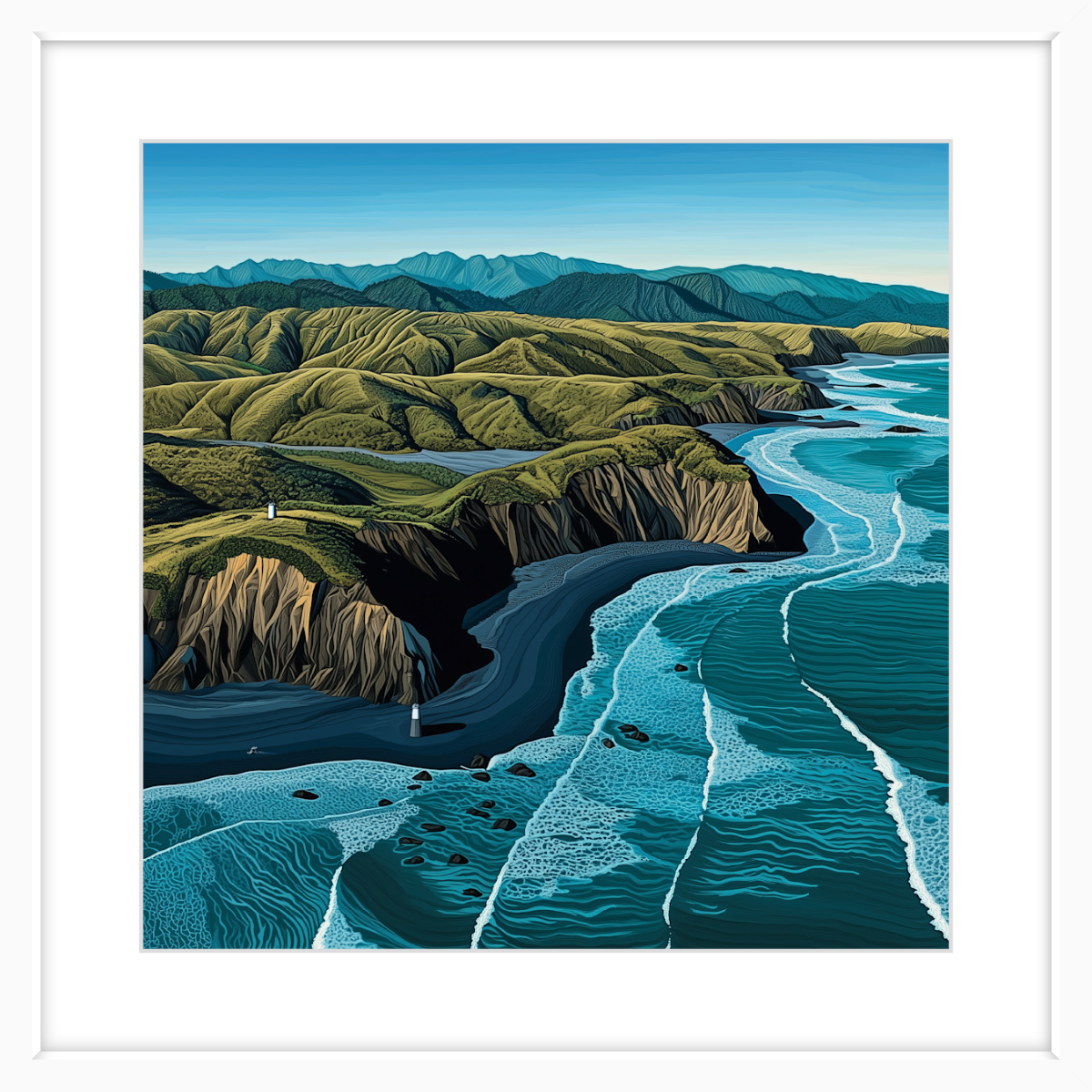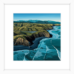 "Above Pencarrow Head" is printed on high quality Epson Enhanced 192gsm matte paper. This paper enables images with sharp detail, high colour saturation and a high gamut. It is quick drying with a flat matte finish and a bright white base that accentuates highlights and tones.