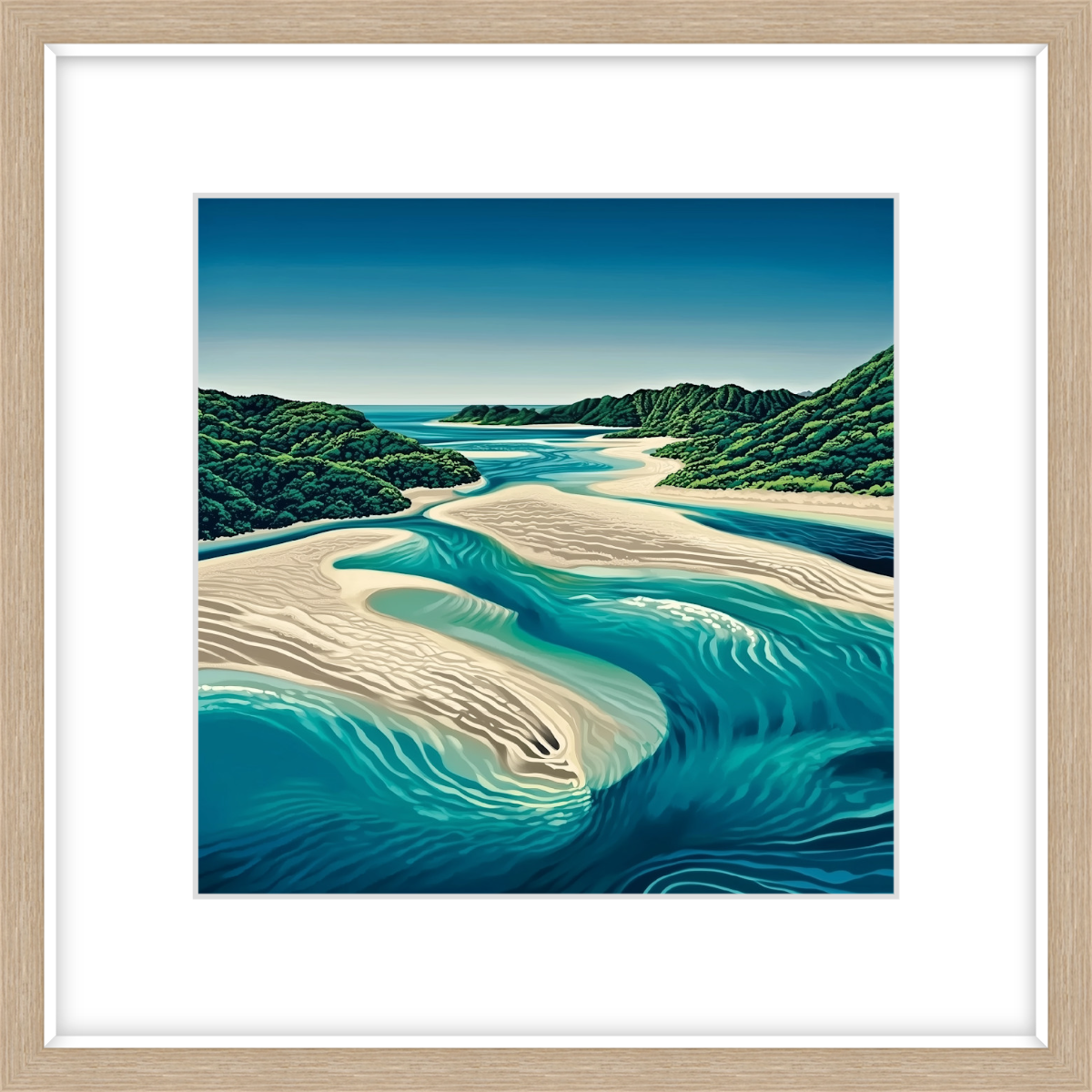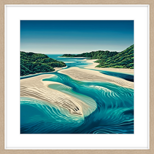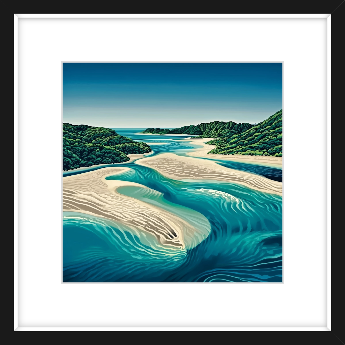 Awaroa Inlet, with its wide golden sandbanks and turquoise waters, is one of the iconic stops on the Abel Tasman Track. This tidal estuary connects hikers with the rhythms of nature. Crossing it requires patience as you wait for low tide. The intricate patterns of the inlet inspired this piece, echoing the natural ebb and flow that shapes this stunning coastline.
