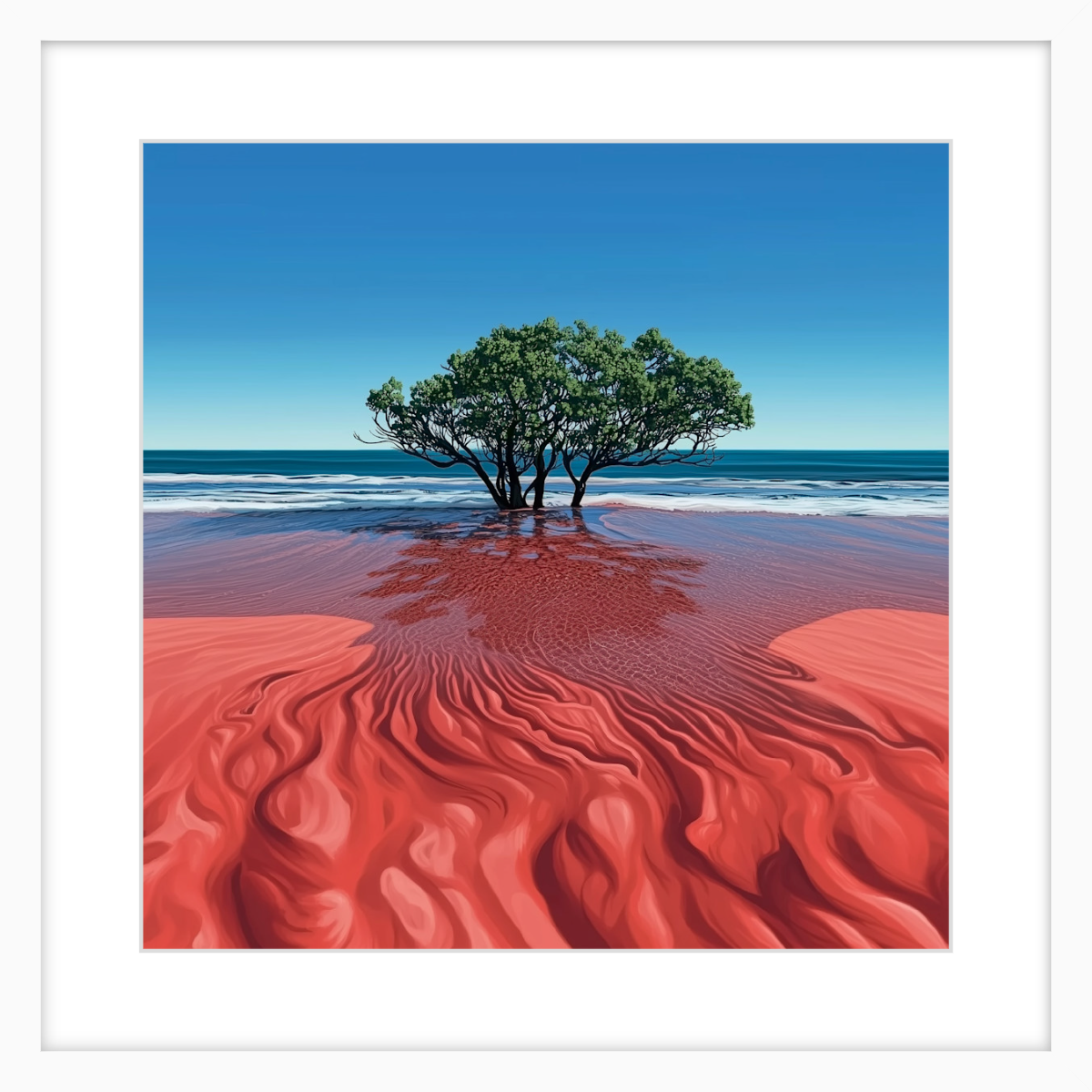 Broome, also known as Rubibi by the Yawuru folk, is nothing short of amazing. Once the biggest pearling port in the world, it has a massive history involving dinosaurs (true!), skulduggery, thievery, slavery and millions of migrating birds. Aesthetically it is incredible “ a peninsula with blue waters on both sides of the town and red-tinged sand from the red rock formations at Gantheaume Point. The tree in this art print is the famous Solitary Tree at Roebuck Bay, best seen at high tide.