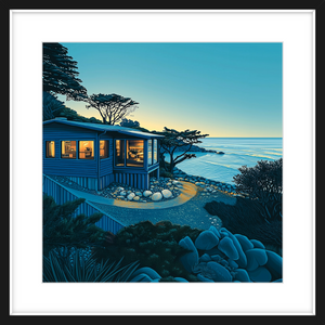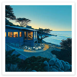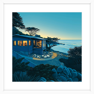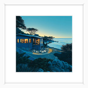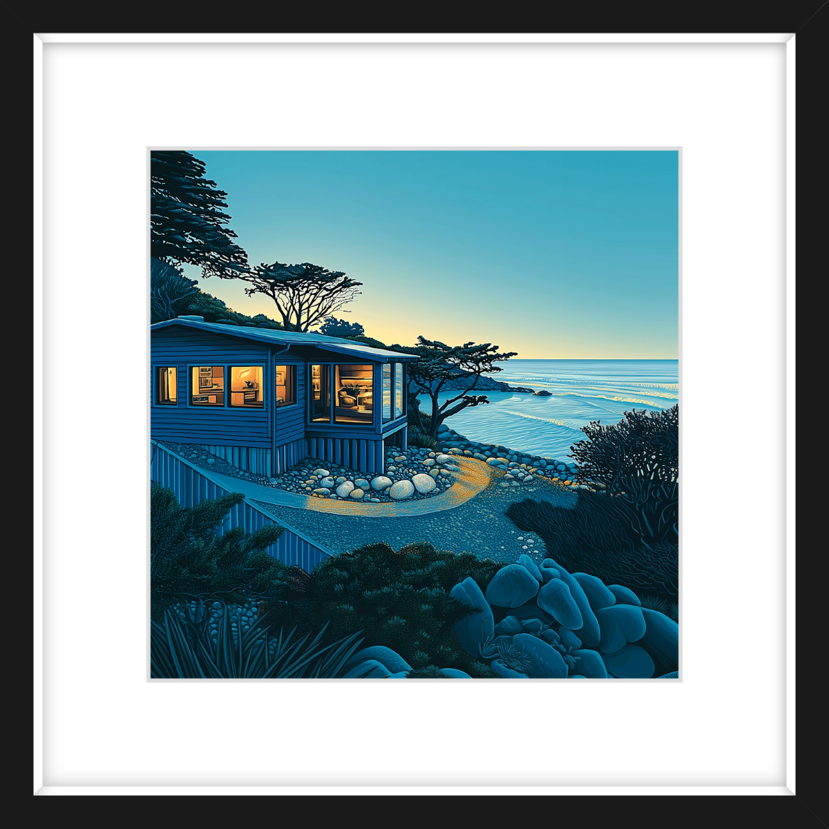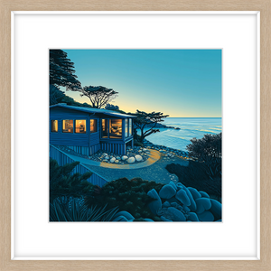 This art print of a California Bungalow beach house is available as a 250x250mm art print, 400x400mm art print, 600x600mm art print and 800x800mm art print. You may also choose to take the hassle out of framing and order it framed, in either black, white or natural.