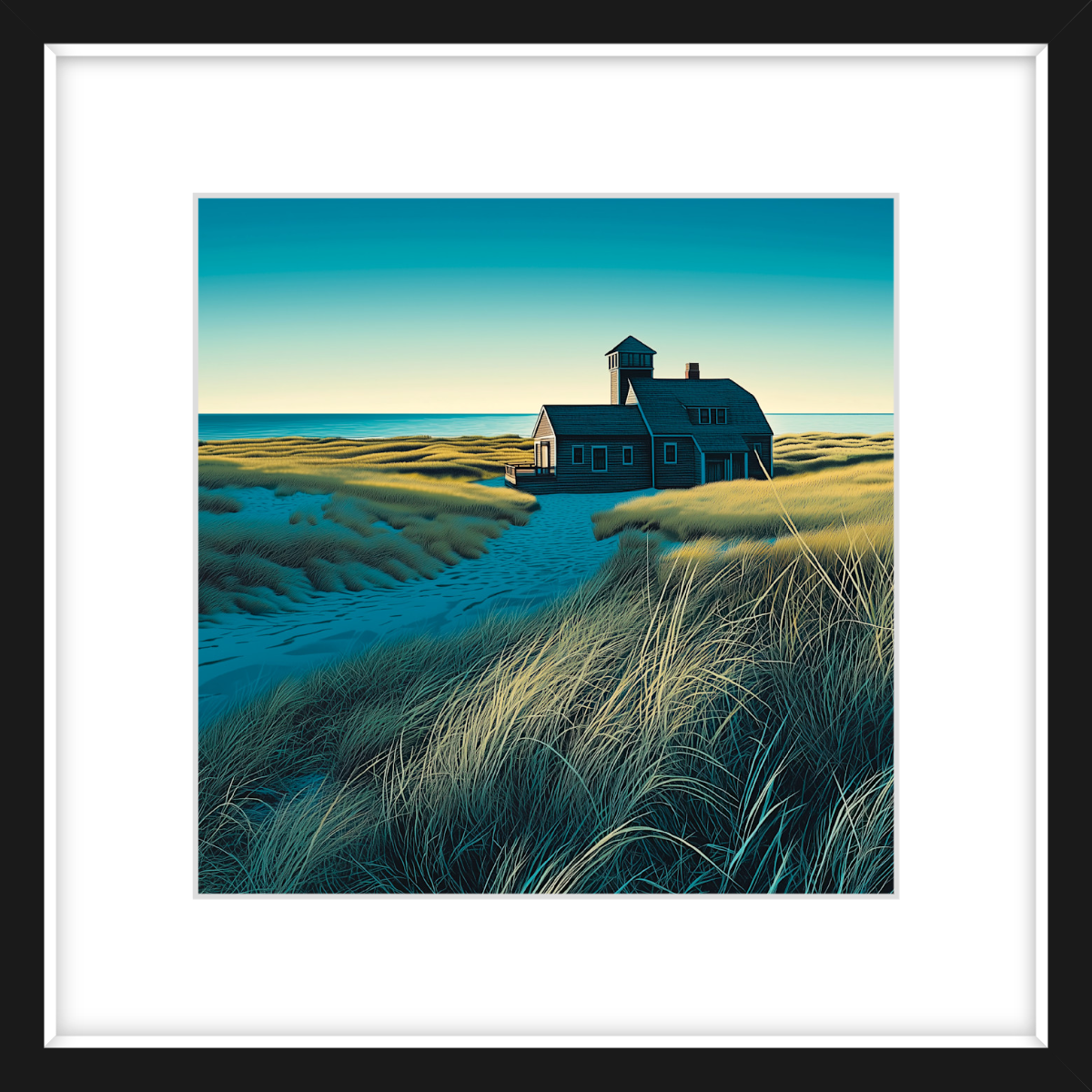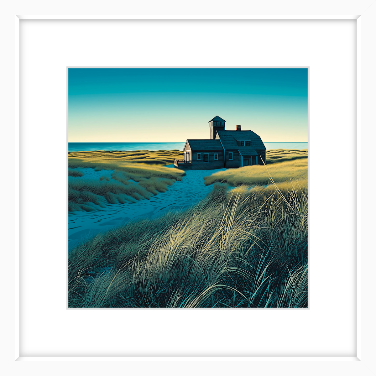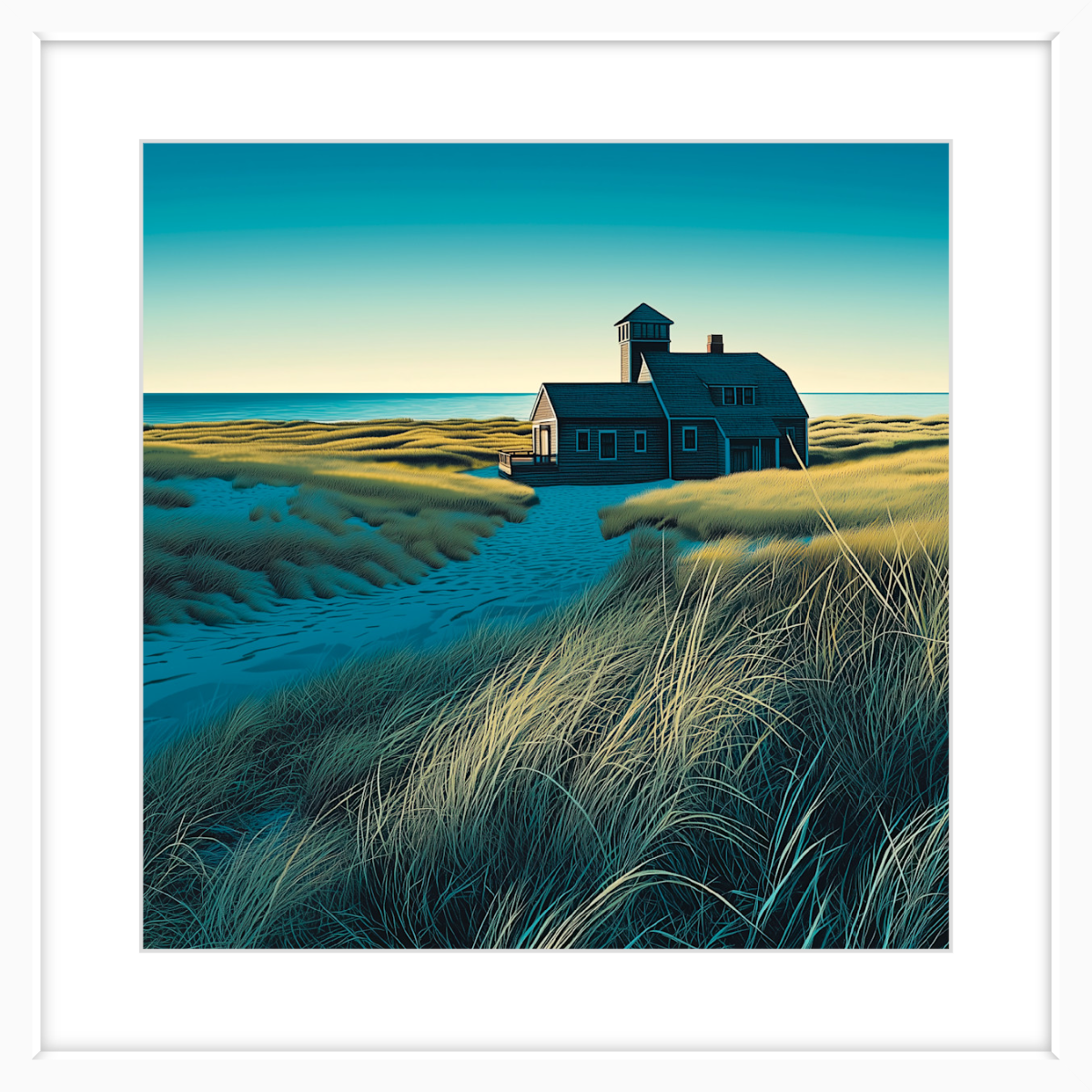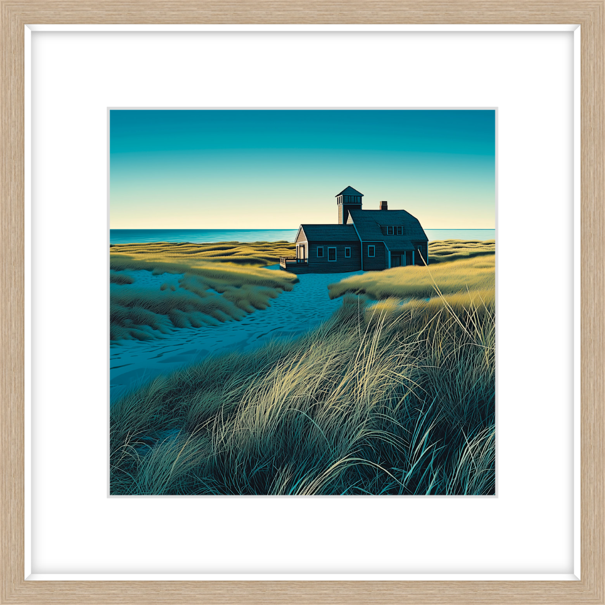 This art print of a Cape Cod beach house is available as a 250x250mm art print, 400x400mm art print, 600x600mm art print and 800x800mm art print. You may also choose to take the hassle out of framing and order it framed, in either black, white or natural.