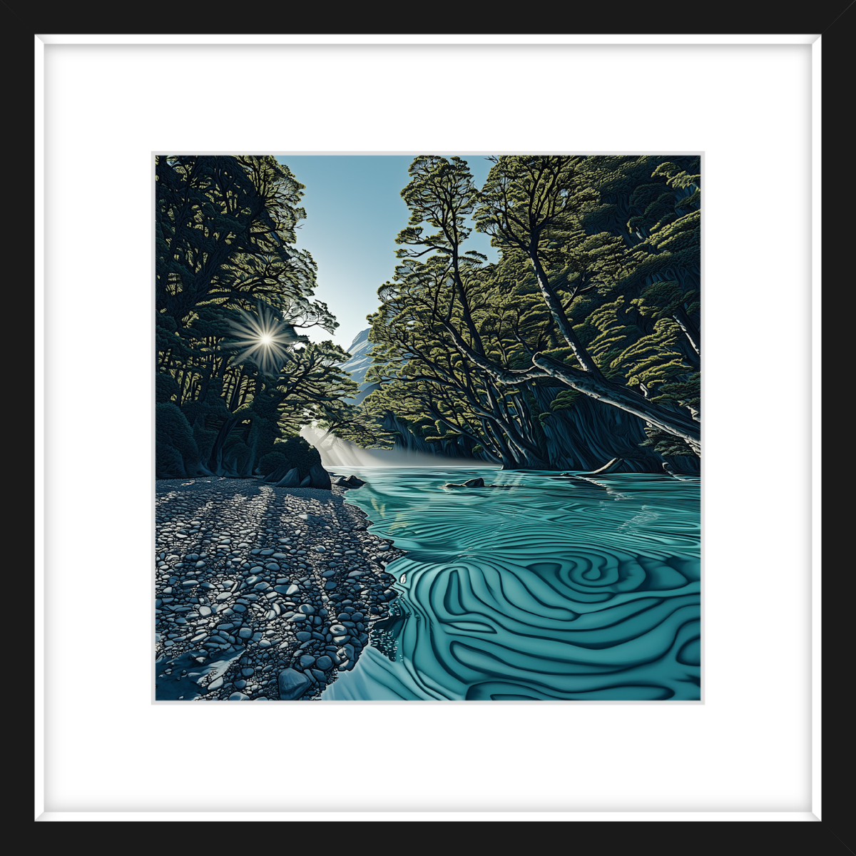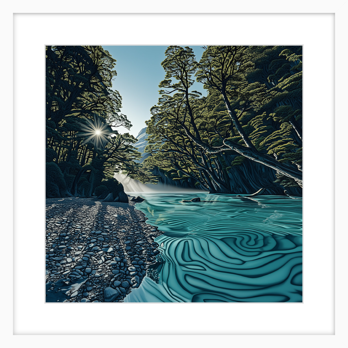 The Clinton River is the lifeblood of the Milford Track, its clear, green waters carving through ancient beech forests and reflecting the towering peaks above. The river is rich with trout, a sign of its pristine condition, and flows through the Clinton Valley before meeting the wild waters of the Arthur River. This artwork captures the clarity and calm of this hidden alpine treasure.