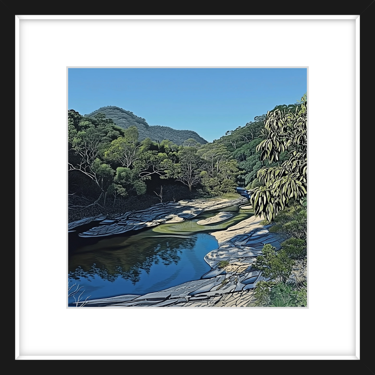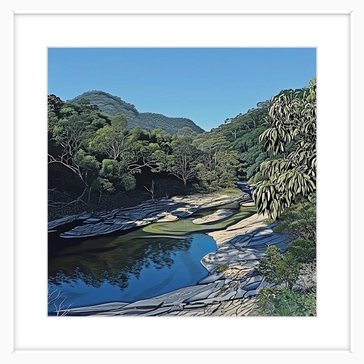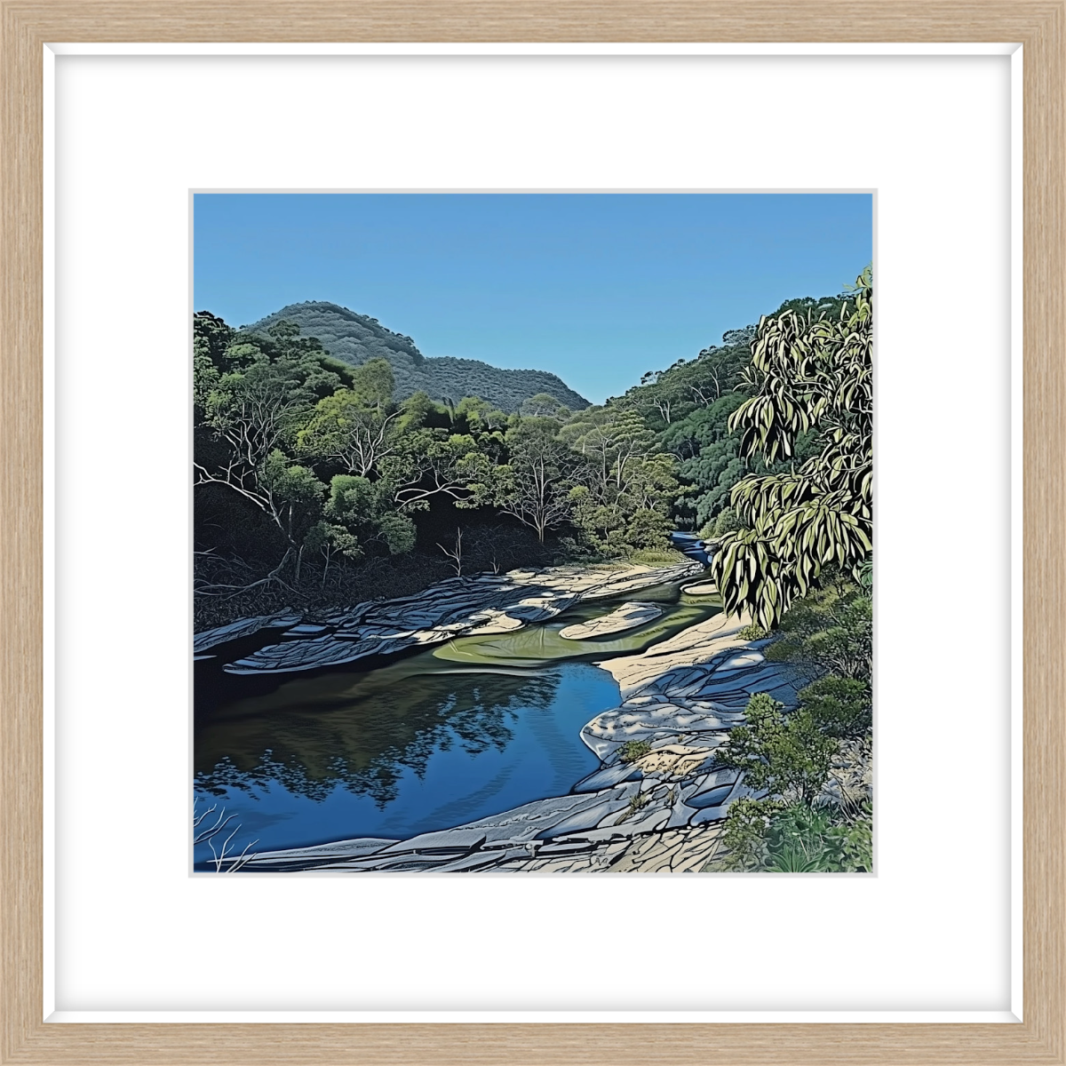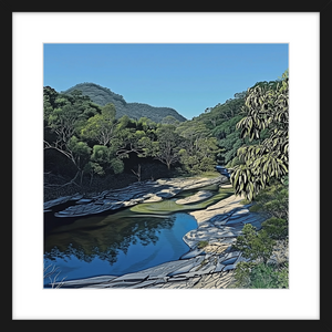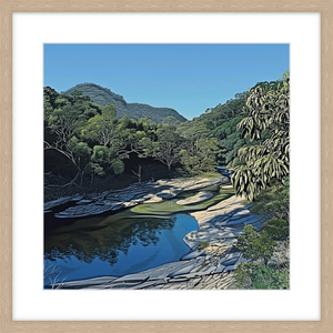 Coxs River offers a quieter, more intimate side of the Blue Mountains. This artwork brings you right into the scene, with its clear water winding through lush green hills. Its perfect if youre after something a little softer but just as captivating as the more famous views.