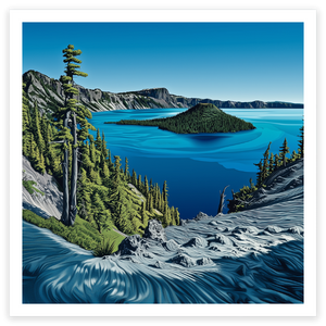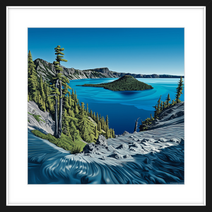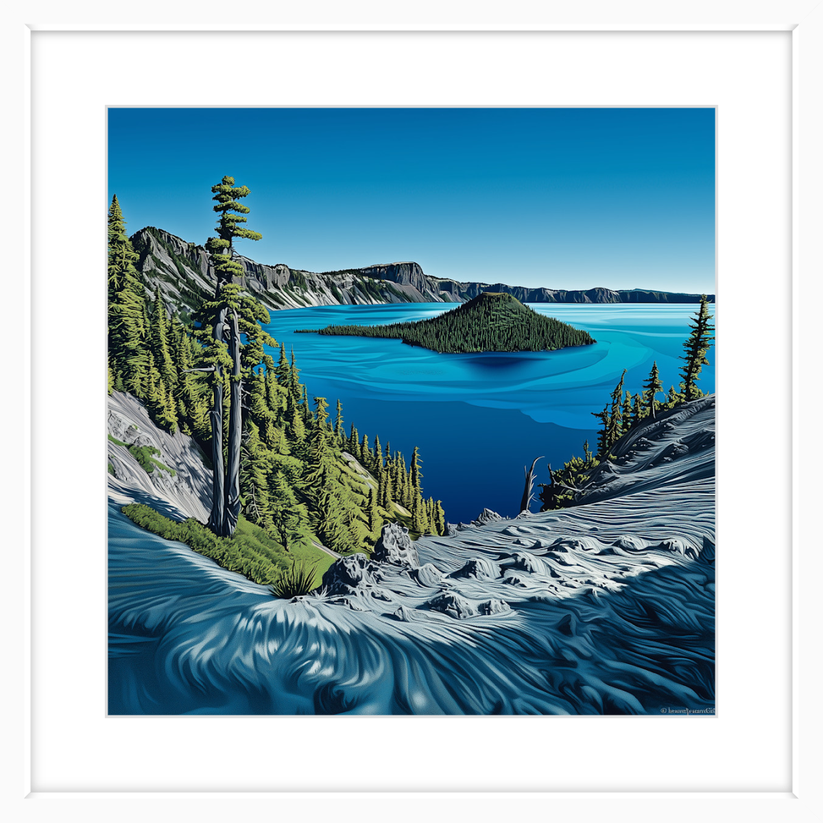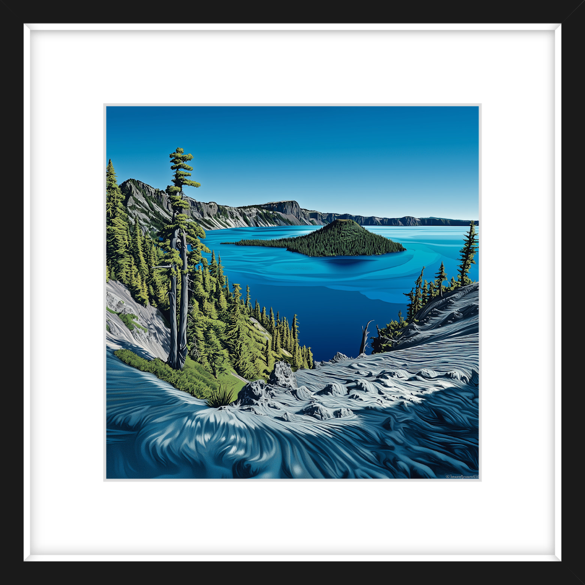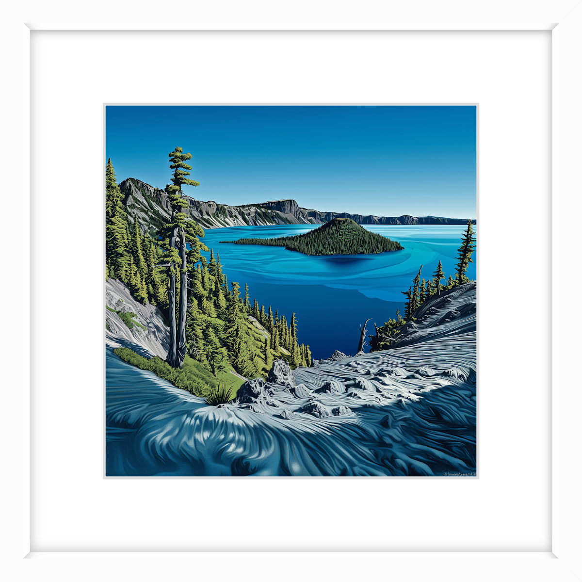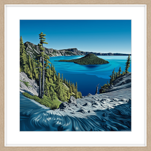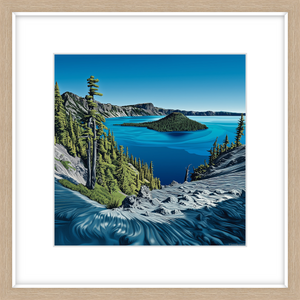 This art print of Crater Lake is available as a 250x250mm art print, 400x400mm art print, 600x600mm art print and 800x800mm art print. You may also choose to take the hassle out of framing and order it framed, in either black, white or natural.