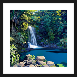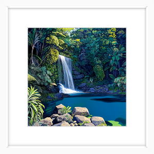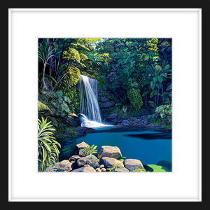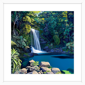 This art print brings out the lush greens and cascading water of Curtis Falls, framed by the rainforests natural beauty. The vibrant colours and delicate details create a calming yet dynamic scene, perfect for bringing the rainforest into your space.