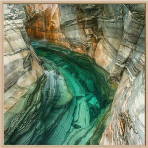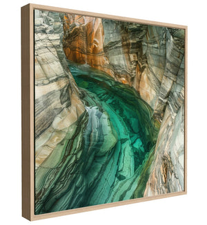 This print captures the peaceful yet powerful moment when icy cold water gracefully tumbles into the gorge's emerald depths.
