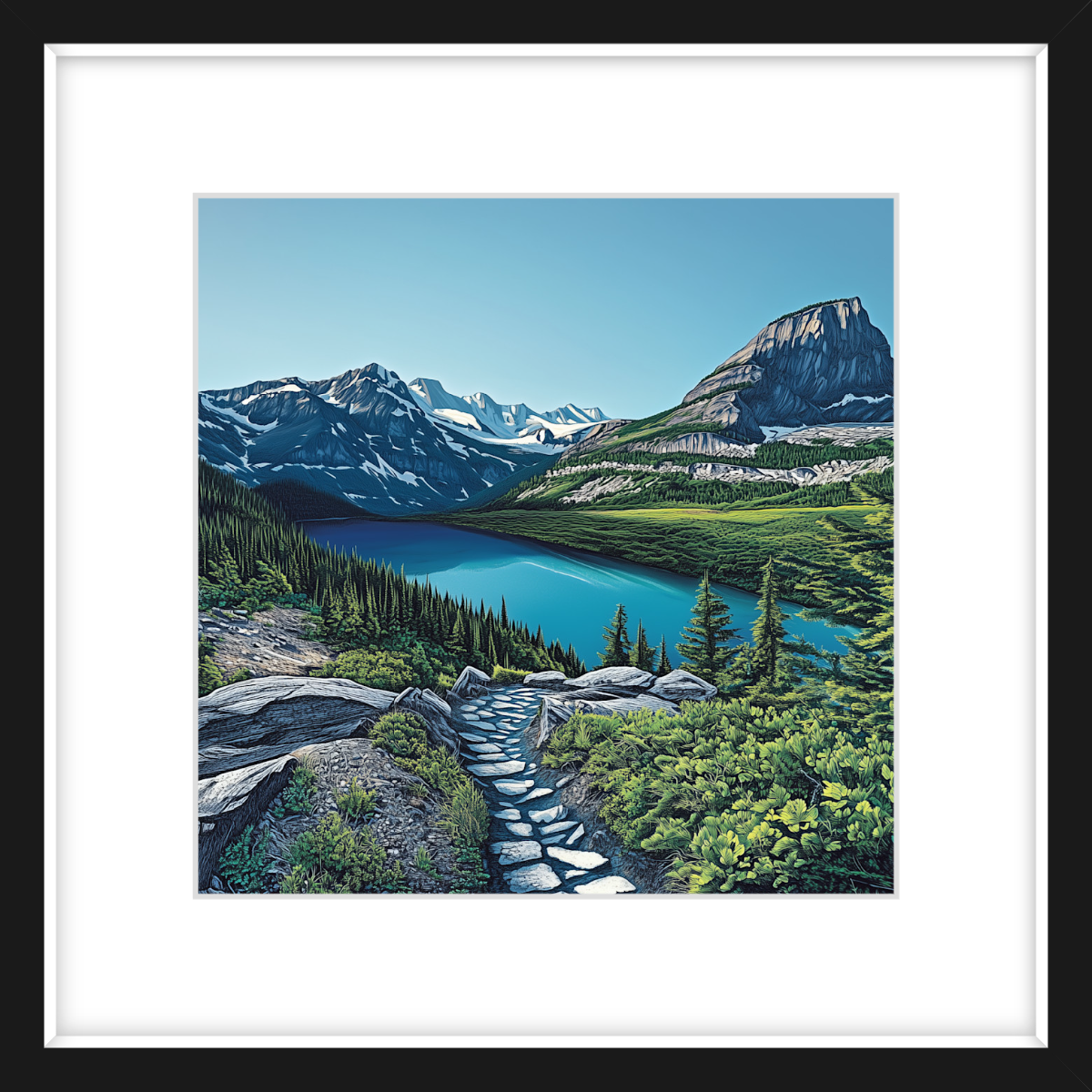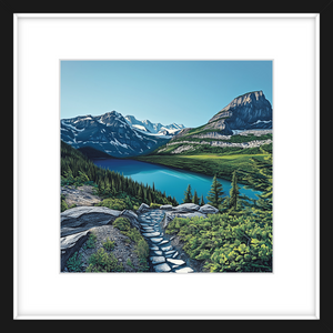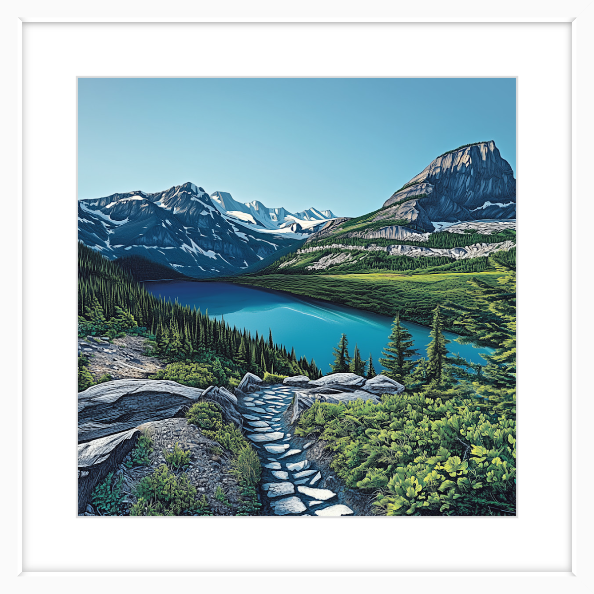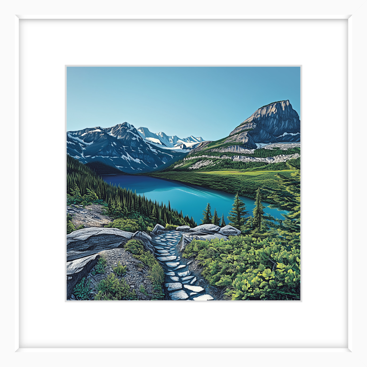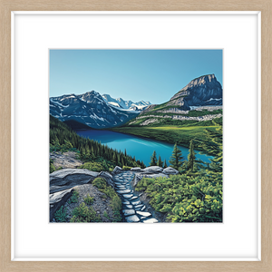This art print of Glacier National Park is available as a 250x250mm art print, 400x400mm art print, 600x600mm art print and 800x800mm art print. You may also choose to take the hassle out of framing and order it framed, in either black, white or natural.