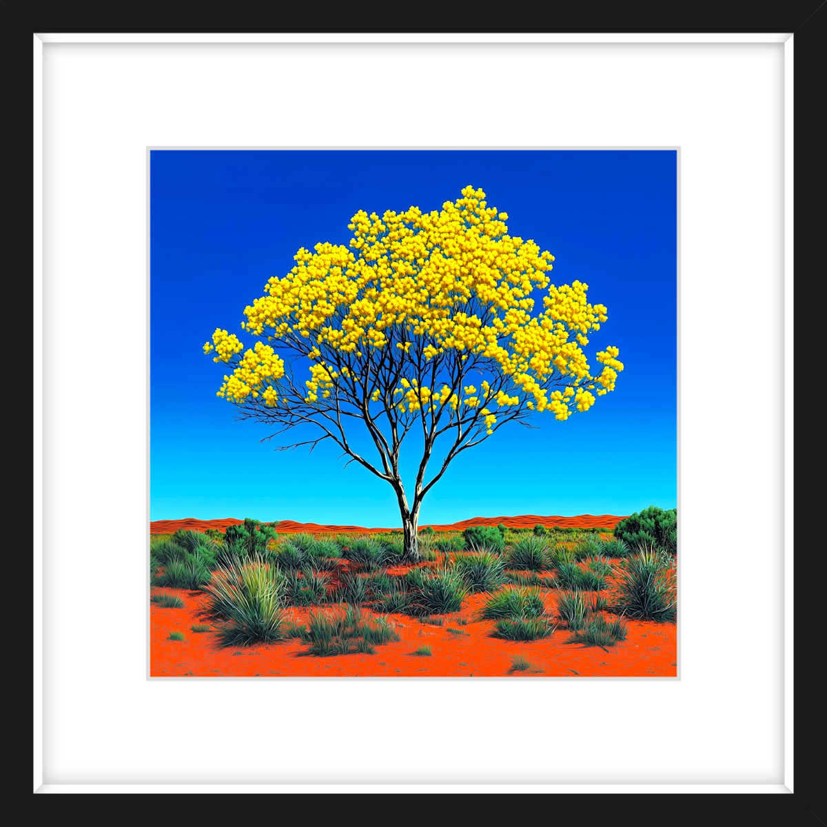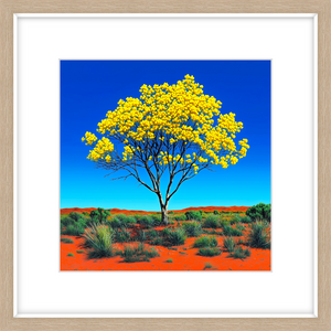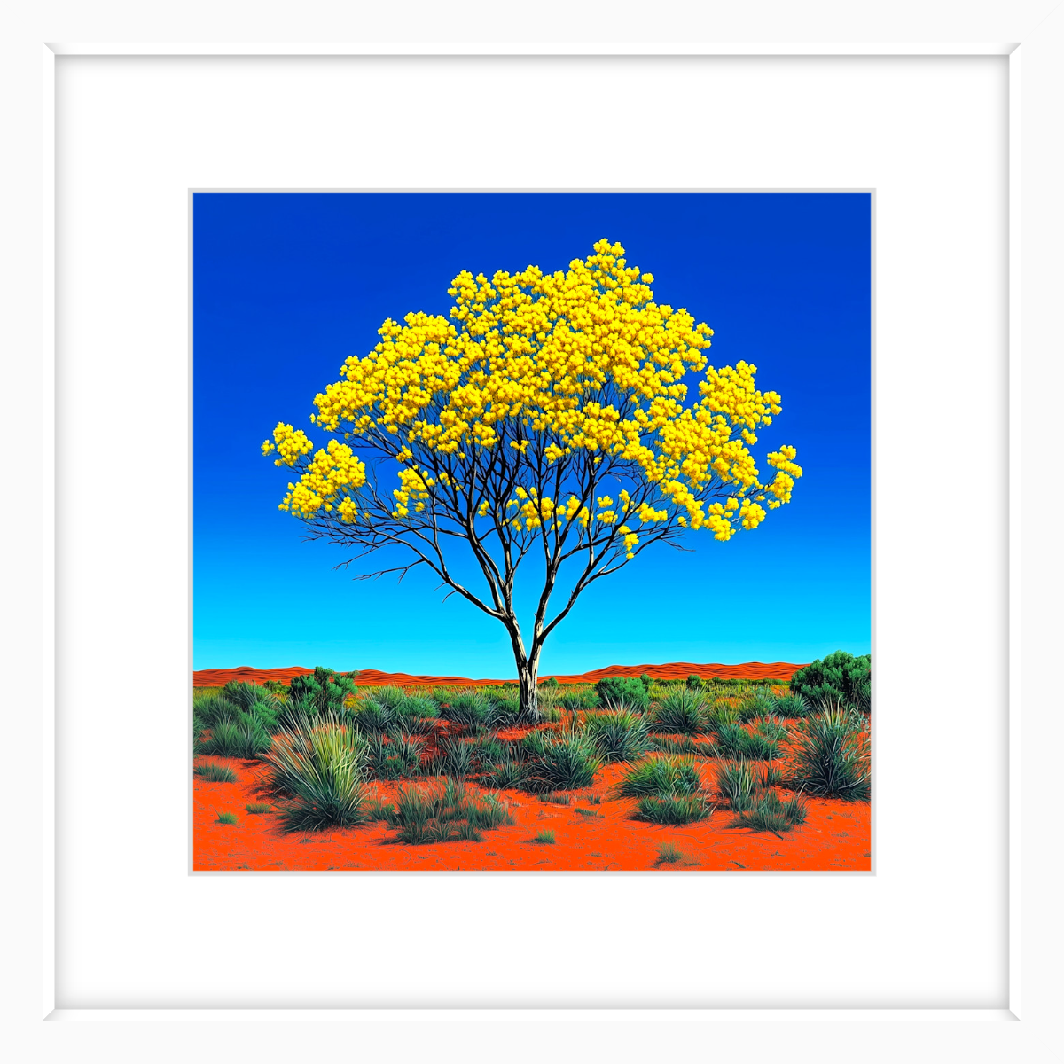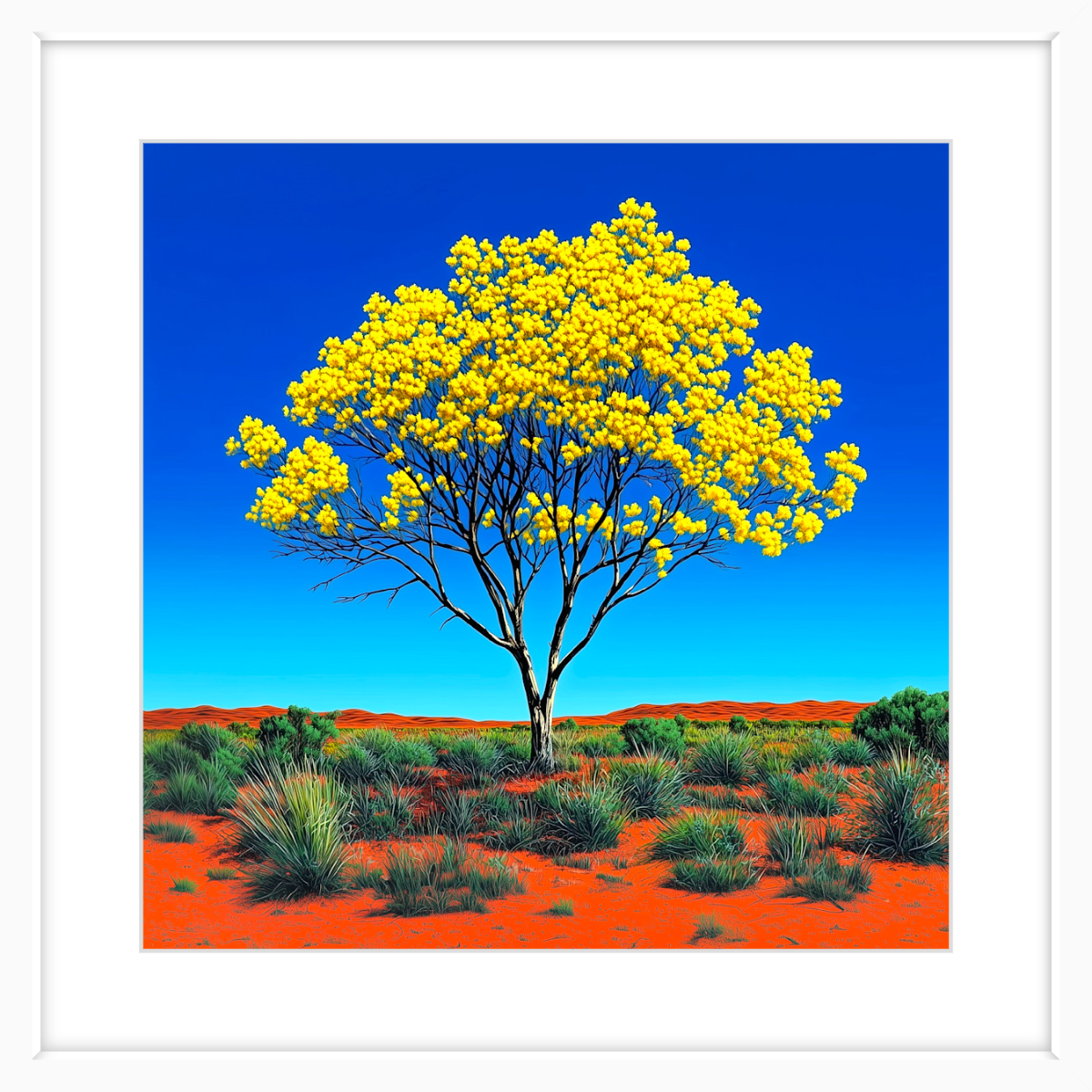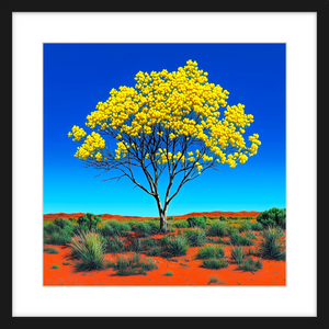 The Golden Wattle isn't just Australia's floral emblem, but a burst of sunshine in tree form. This print captures its cheerful yellow blooms, popping against deep blue skies. Its a feel-good piece with bold, happy energy that'll brighten up any room.