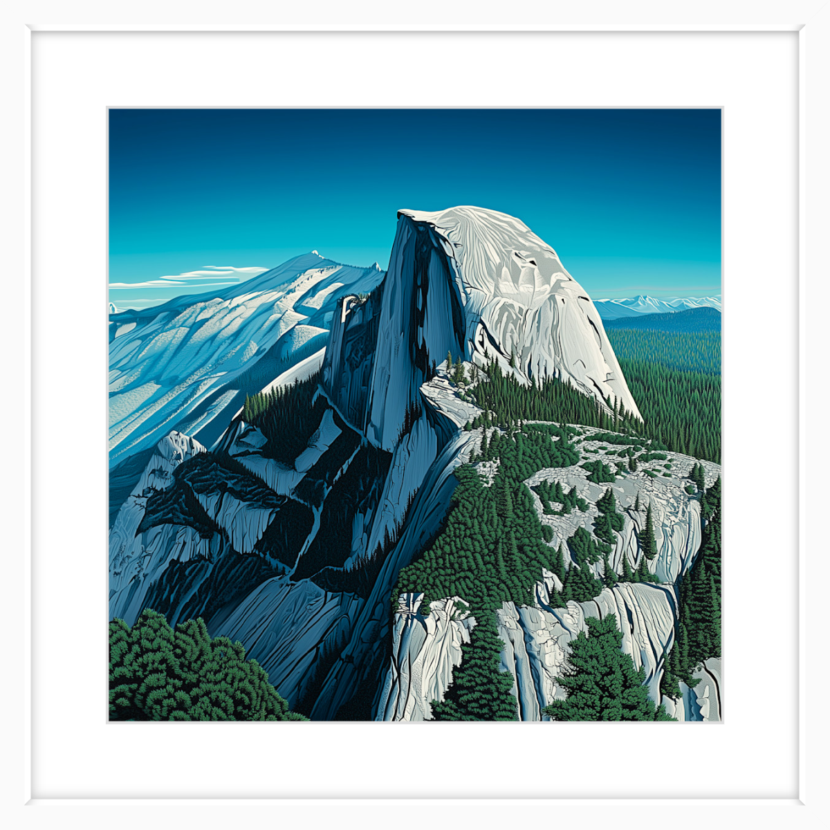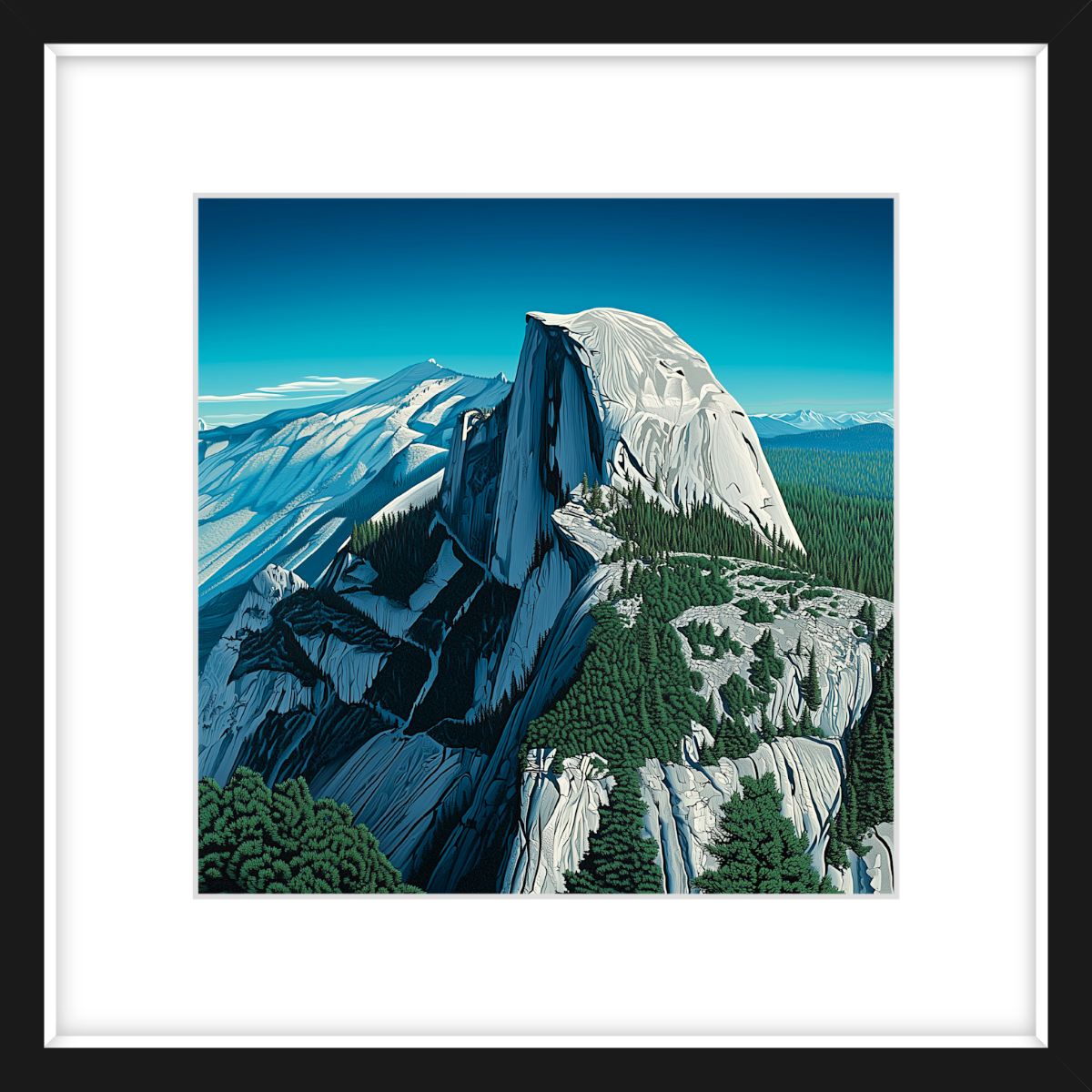 If you’re into adventure, you’ll know the feeling. The sheer face of Half Dome rises before you, solid and unshakable, yet somehow alive with the play of light and shadow. You can almost feel the cool breeze rolling down from the peaks, carrying the scent of pine and earth. This piece looks incredible framed in black, the bigger the better.