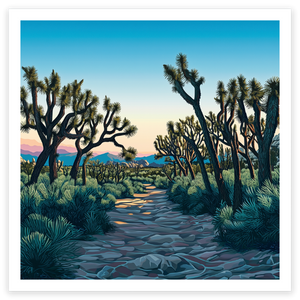 As twilight settles over the desert, the twisted silhouettes of Joshua trees stretch toward the sky, casting long, dramatic shadows. The warm air hums with stillness, the scent of dry earth lingering as the last light fades. This artwork carries that dreamlike energy, making any space feel a little more mysterious, a little more infinite, like a quiet invitation to explore beyond the familiar.