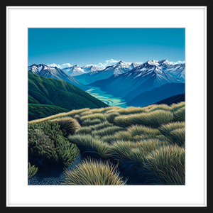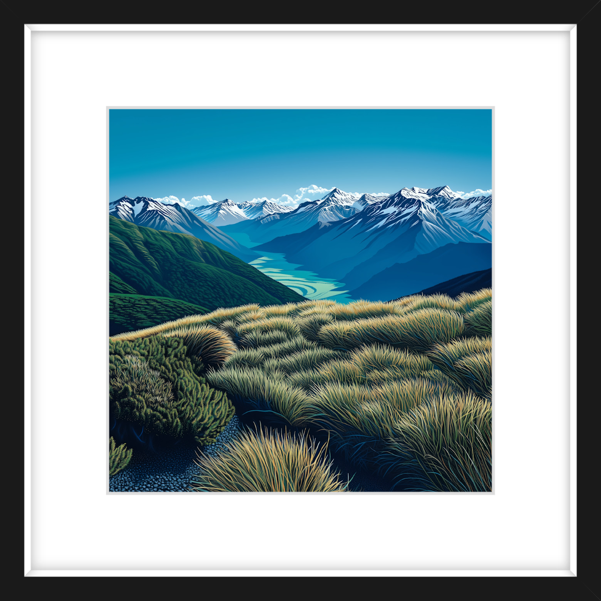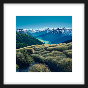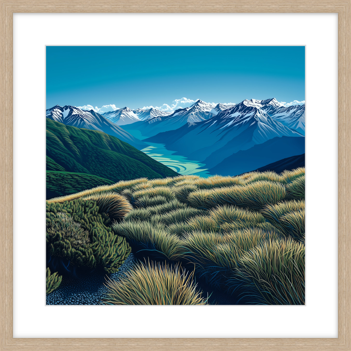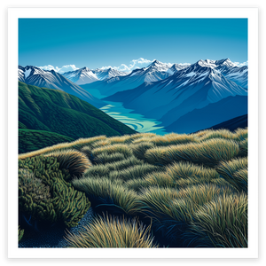 The Kepler Track's tussock-covered ridgelines offer a dramatic vantage point over the glacial lakes and deep valleys below. Constructed in 1988 to ease pressure on the other Great Walks, the trail was designed to show off Fiordland's grandeur. It certainly achieves that. This piece reflects the exposed beauty of the track's alpine sections, where you feel completely immersed in the untamed landscape.