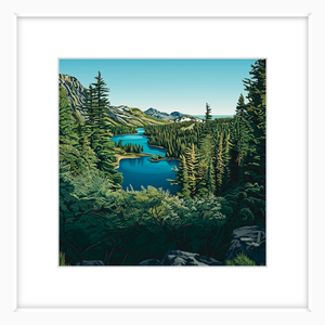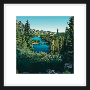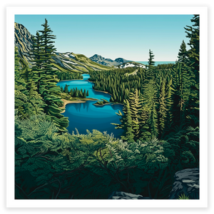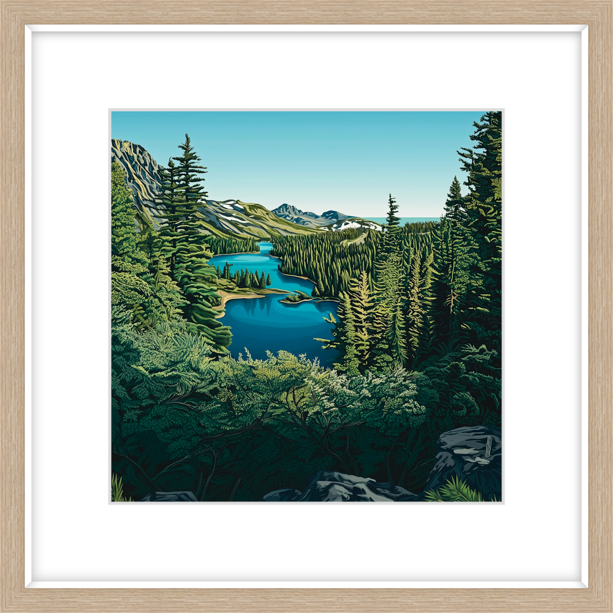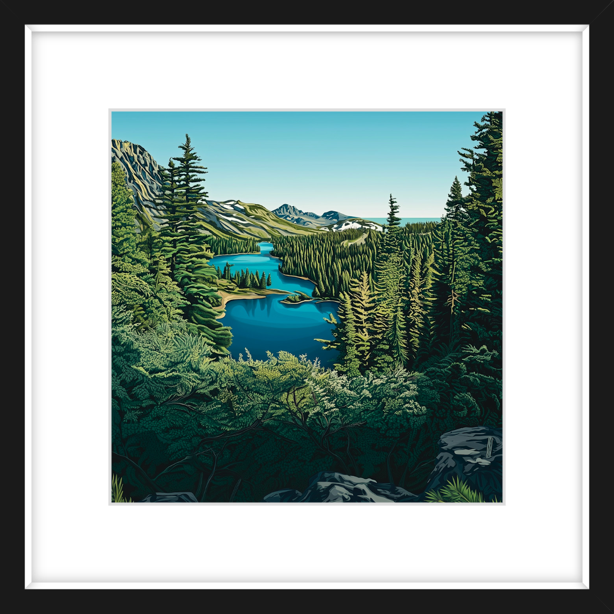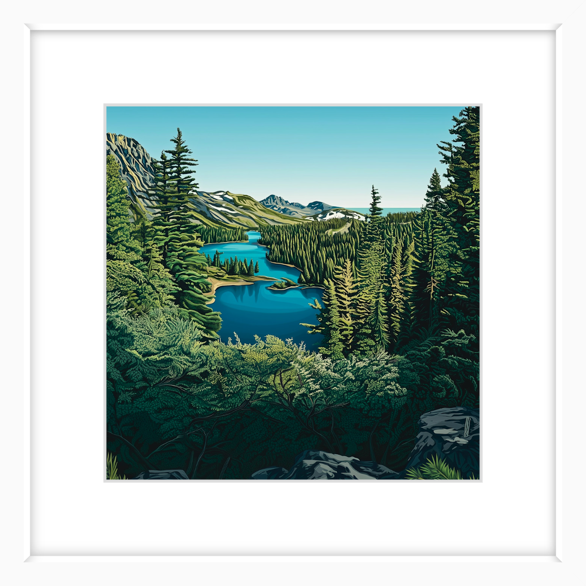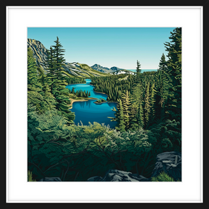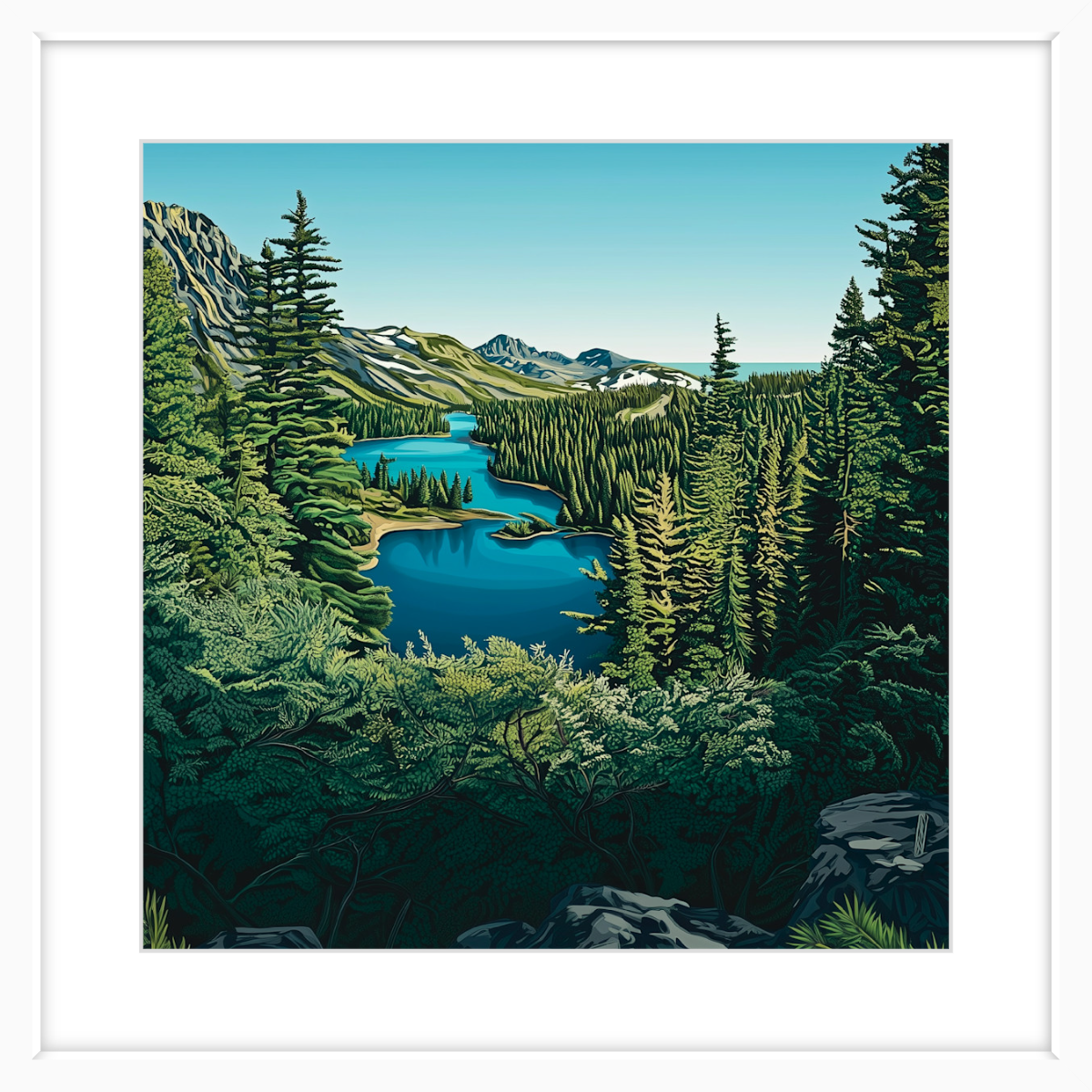 Stand at the edge of the lake and take it all in, from the deep blue waters and the rich greens of the towering pines, to the way the sky stretches endlessly above. There’s something about this scene that invites reflection, a moment of pure quiet where the only movement is the ripple of water and the rustle of the trees. This is the kind of art that transforms a room, infusing it with a sense of depth, clarity, and peace.