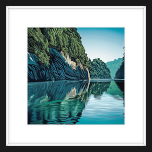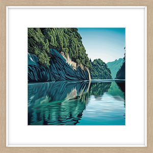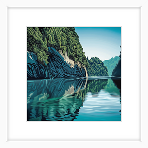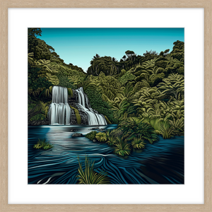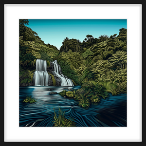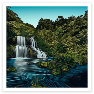 Lake Waikaremoana, nestled in Te Urewera, is known for its untouched beauty and cultural significance to the Tūhoe people, the ˜Children of the Mist. The lakes many waterfalls, including those along the trail, are fed by the regions frequent rain, adding a sense of drama to the forested landscape. This piece captures the movement and energy of the waterfalls, contrasting with the lakes tranquil expanse.