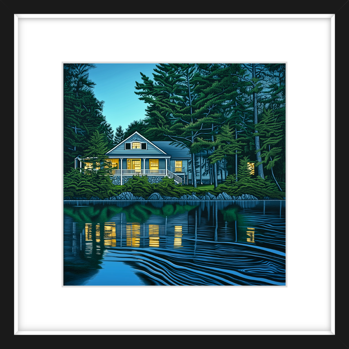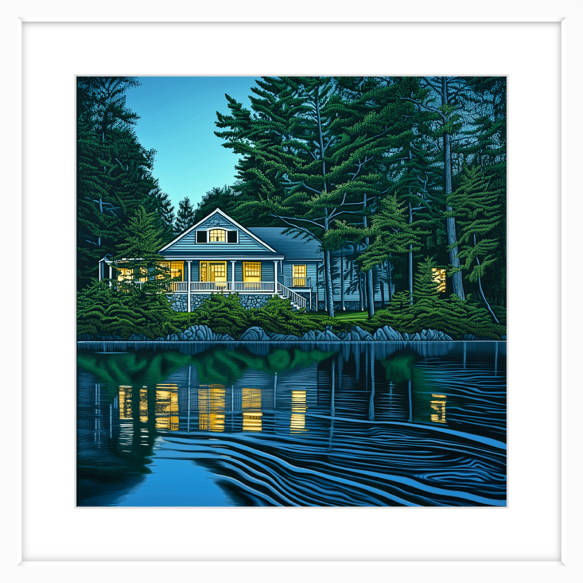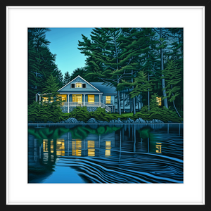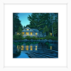This art print of a lakehouse in Maine is available as a 250x250mm art print, 400x400mm art print, 600x600mm art print and 800x800mm art print. You may also choose to take the hassle out of framing and order it framed, in either black, white or natural.