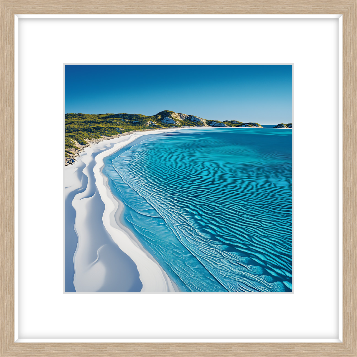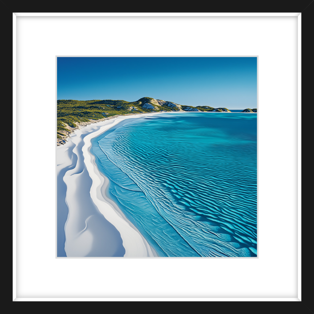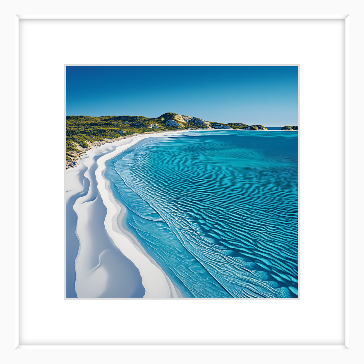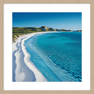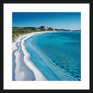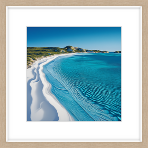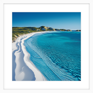A pristine stretch of white sands and crystal-clear turquoise waters defines this peaceful scene. The ripples of sand where the water has made its mark, along with the vibrant colour of the sea perfectly captures the untouched beauty of one of Western Australia's most iconic beaches.