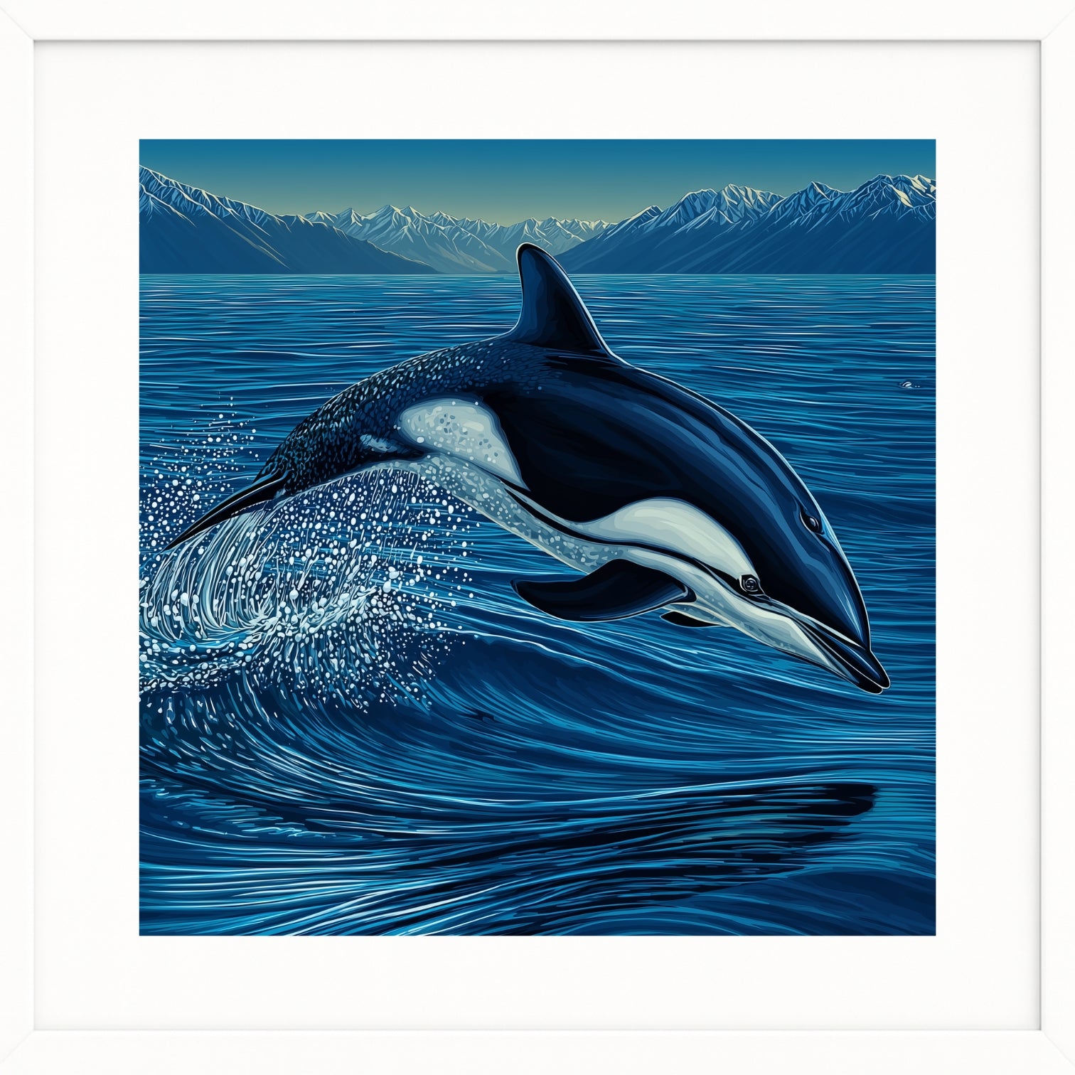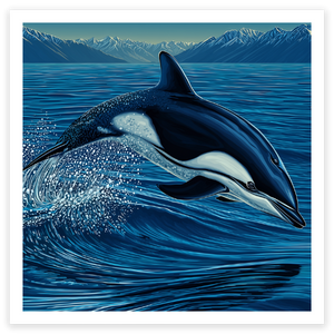 The rarest dolphin in the world, Maui’s dolphin lives only in the shallow coastal waters of New Zealand’s North Island. This artwork captures both their playfulness and their fragility, reminding us how close we are to losing them forever.