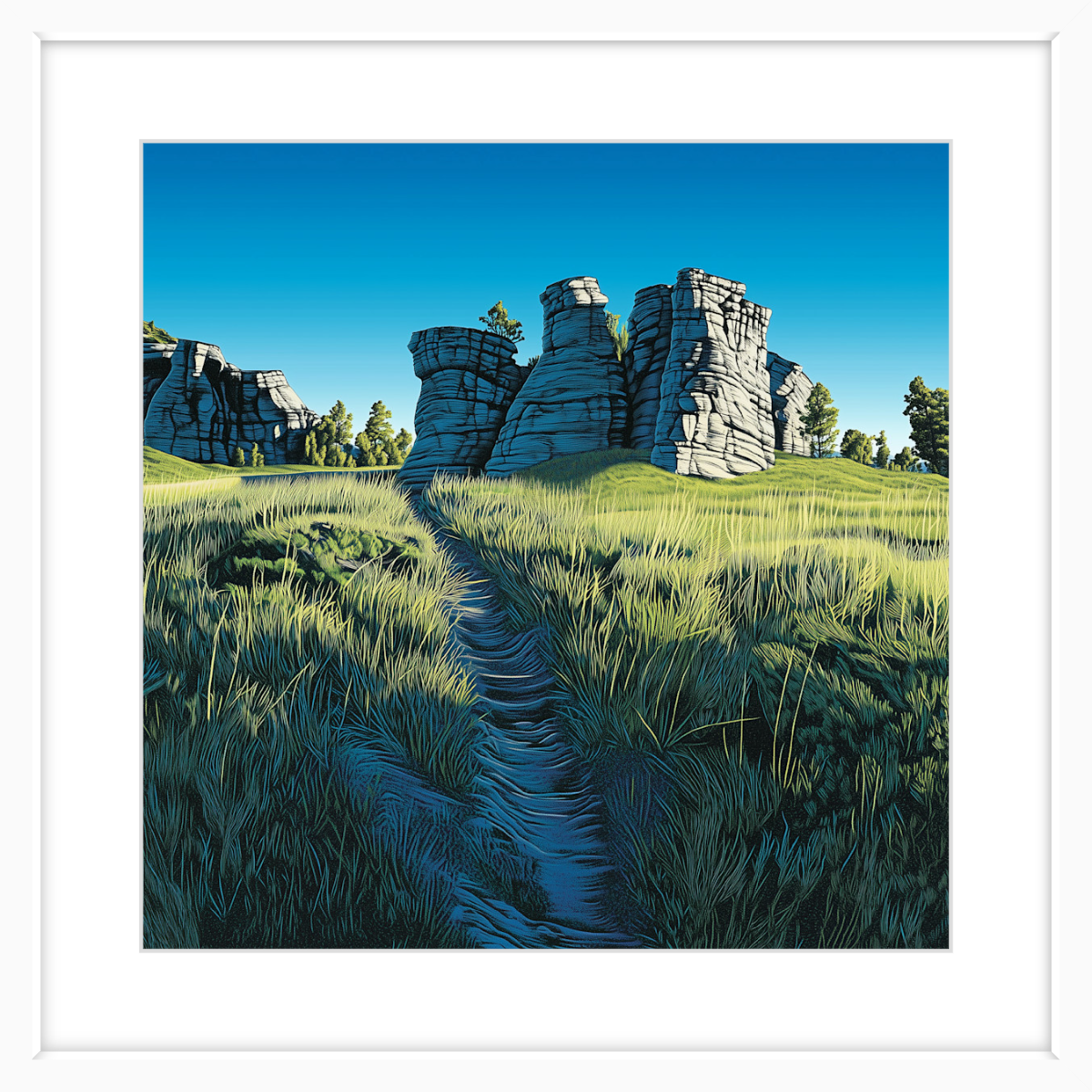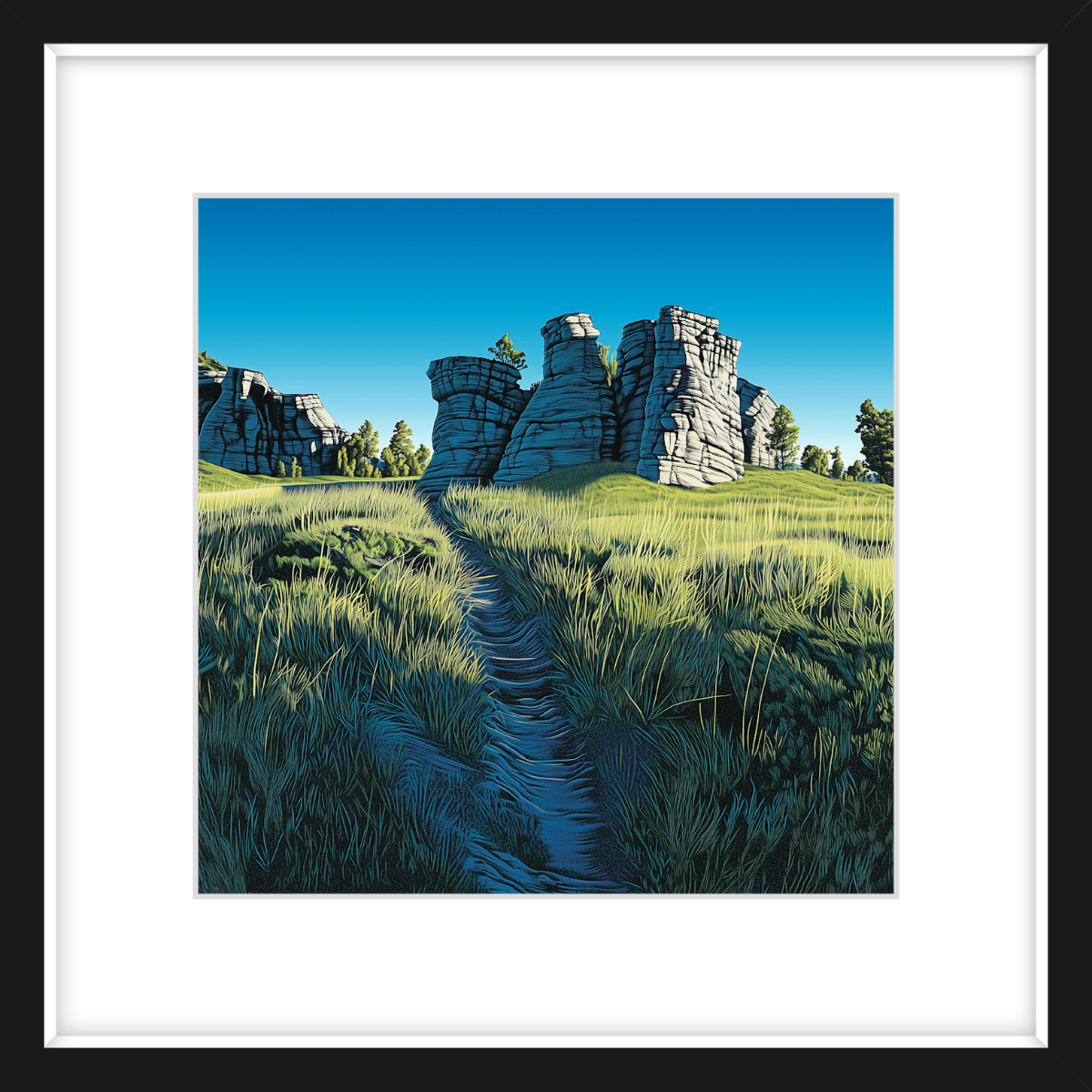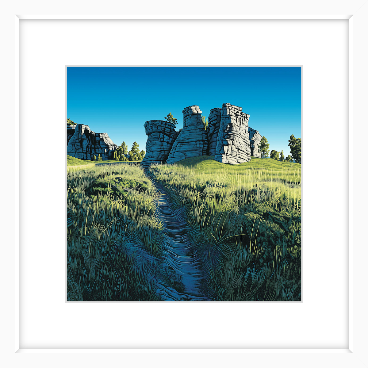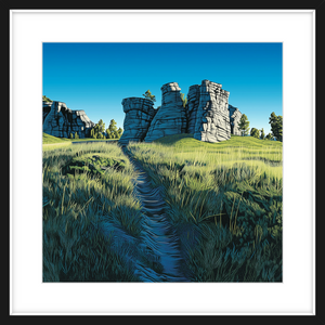 This art print of Medicine Rocks is available as a 250x250mm art print, 400x400mm art print, 600x600mm art print and 800x800mm art print. You may also choose to take the hassle out of framing and order it framed, in either black, white or natural.
