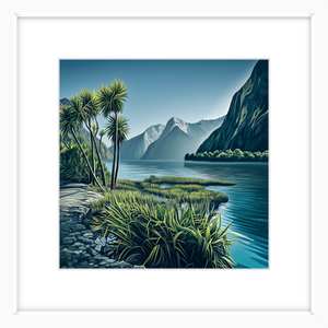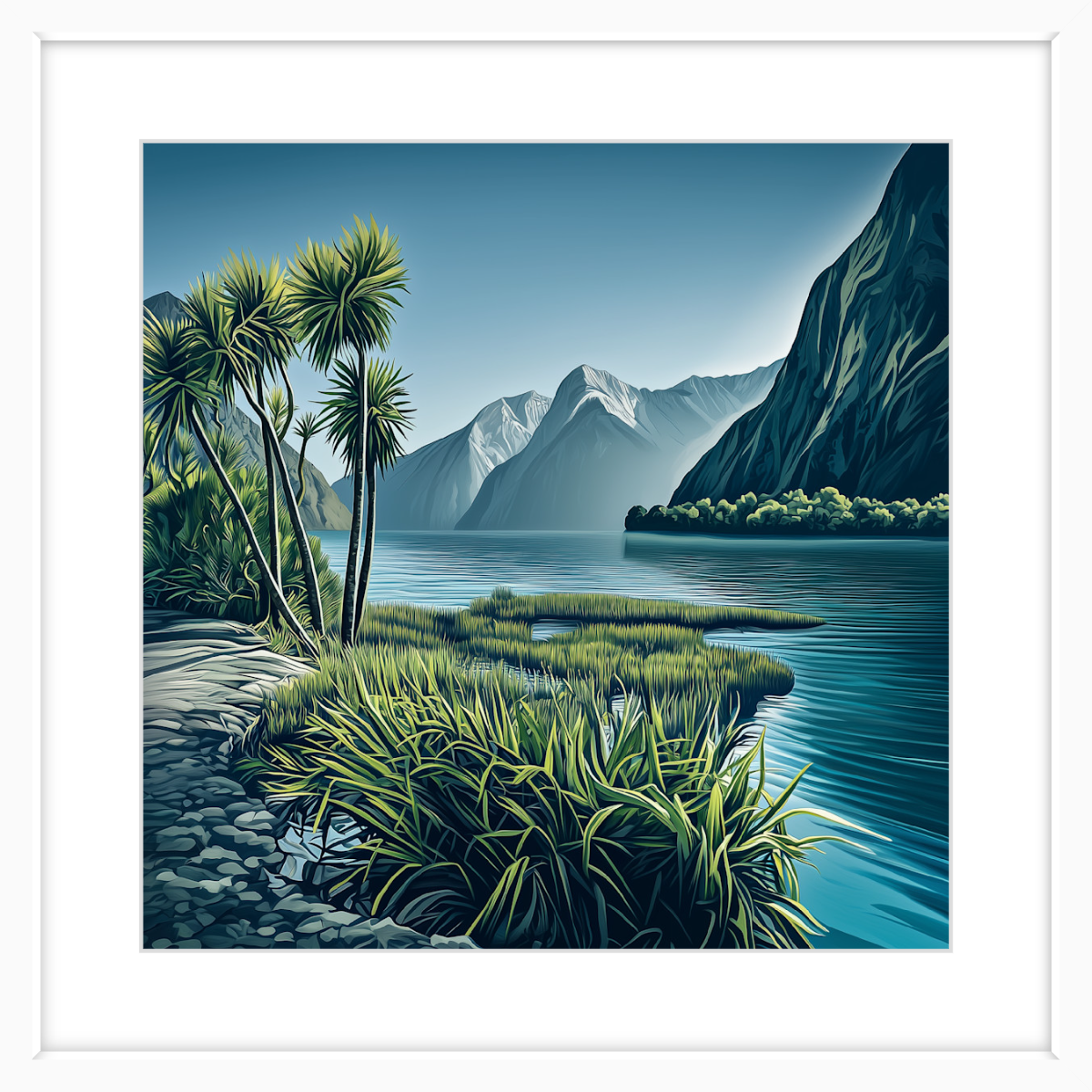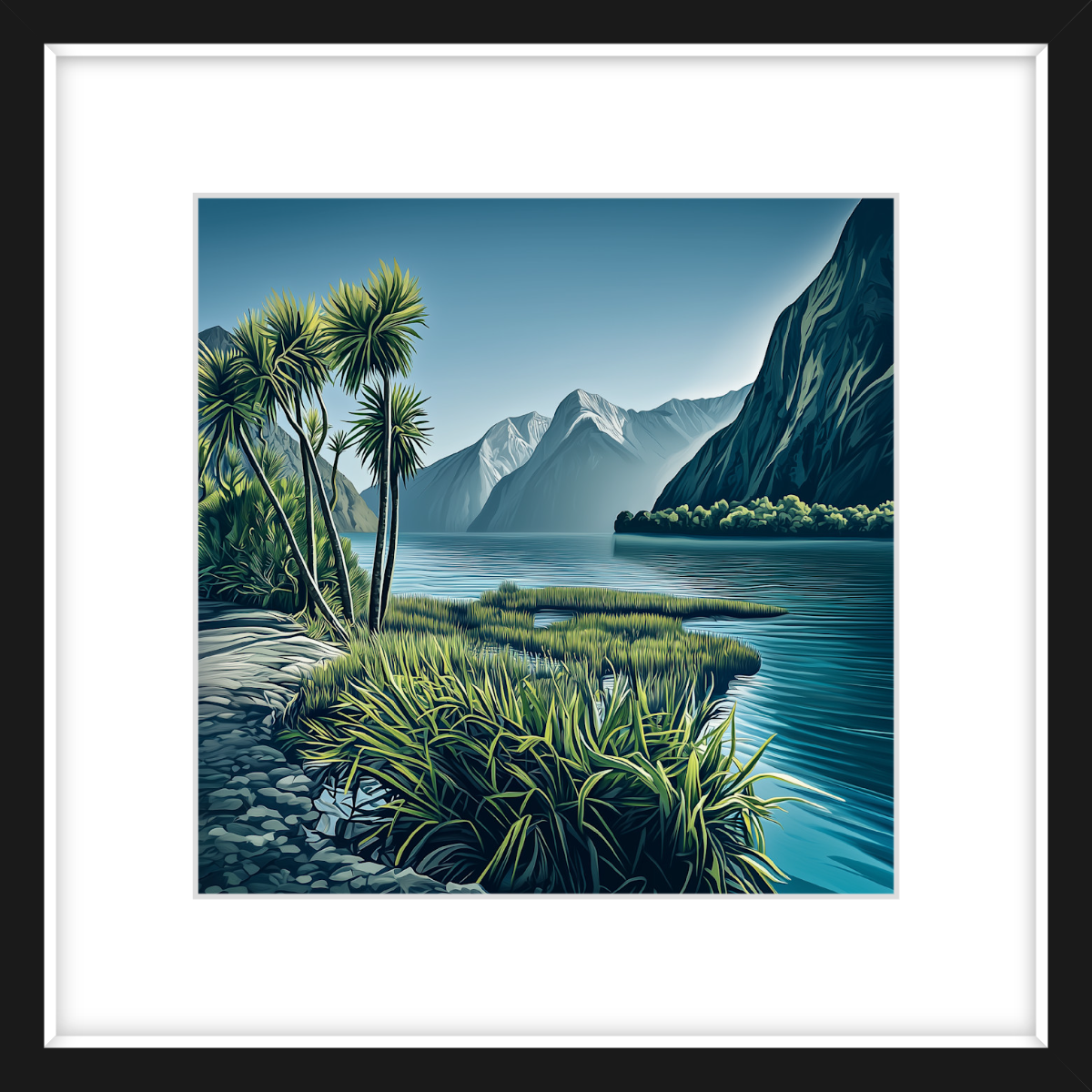 Sometimes, the beauty of Milford Sound isn’t just in the towering peaks or the mirror-like water, but in the lush, vibrant greenery that frames the scene. This is a different perspective, drawing the eye to the cabbage trees standing proudly along the rocky shore, spiky fronds contrasting against the smooth, glassy water. Order this print unframed or framed, with free shipping worldwide.