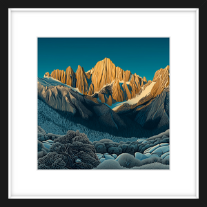 The first light of dawn spills across the jagged peaks, turning them into glowing spires against the cool blue sky. The air is crisp, the silence absolute. It’s a moment of stillness before the day begins, a reminder of how small we are in the face of nature’s grandeur. This piece carries that feeling into your home, a quiet strength, a sense of the world’s vastness, and the inspiration to chase your own summits. Looks amazing in a black frame!
