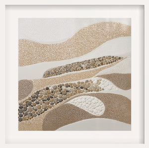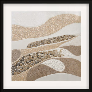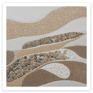 A meandering stream is suggested in flowing layers, dotted with earthy textures and softened by muted tones. Clusters of pebble-like forms shift between light and dark, evoking the gentle rhythm of water moving through stone. Perfect for spaces where calm and reflection are valued, from living rooms to quiet retreats.