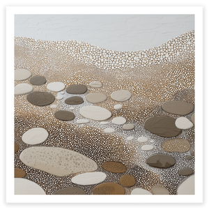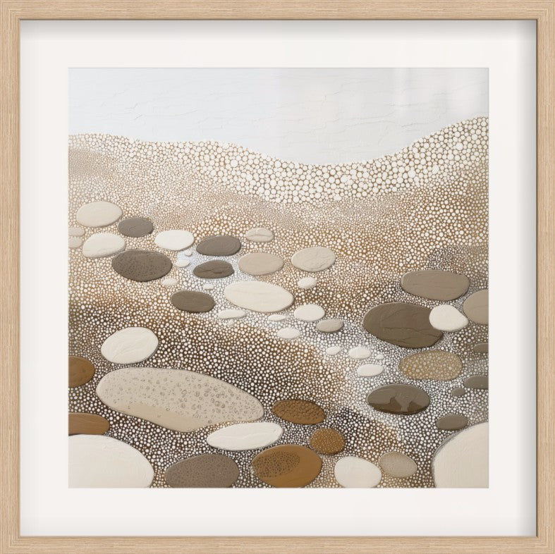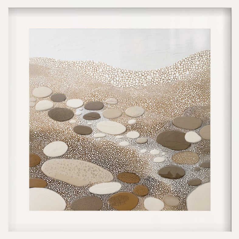 Smooth stone forms scatter across a field of delicate stippling, each shape unique yet harmonious within the whole. The neutral palette highlights texture and variation, turning a simple arrangement of pebbles into a quiet study of balance and calm. An understated piece that complements minimalist interiors, coastal homes, or any space seeking balance and ease.