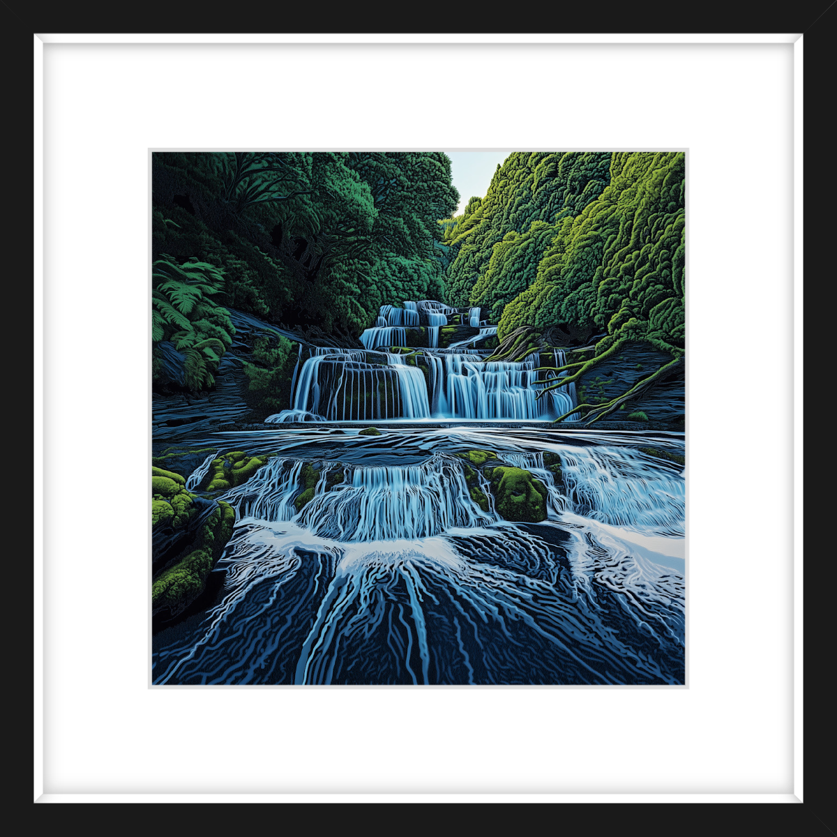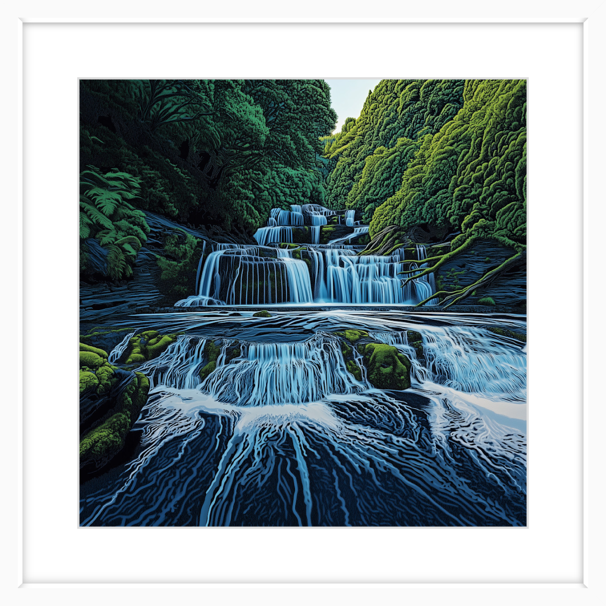 Purakaunui Falls, with its tiered structure and forested surroundings, is presented in this artwork as a study of balance and texture. A piece that invites contemplation.