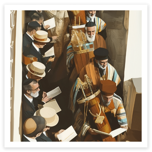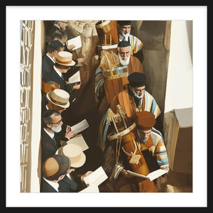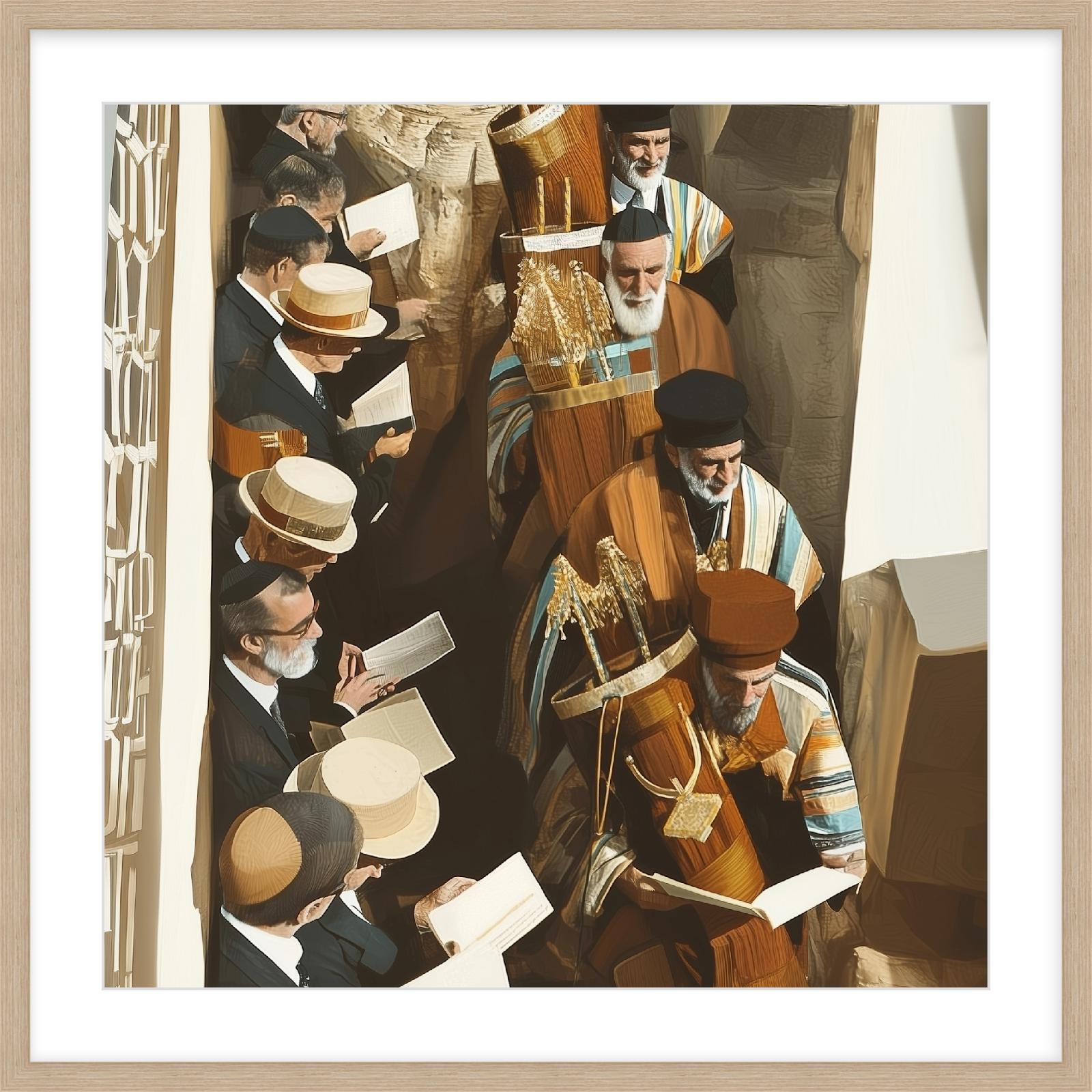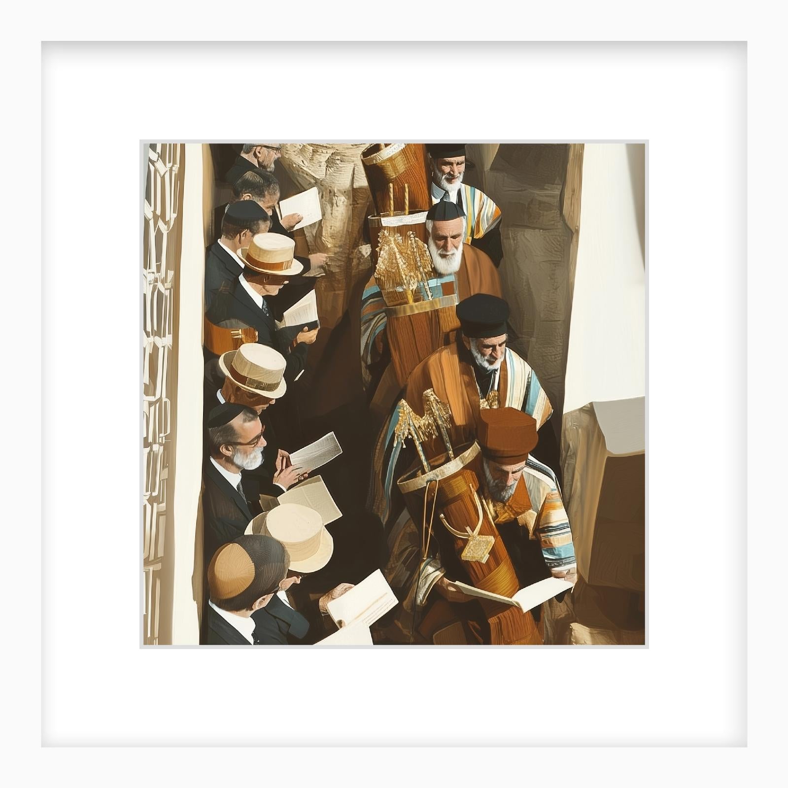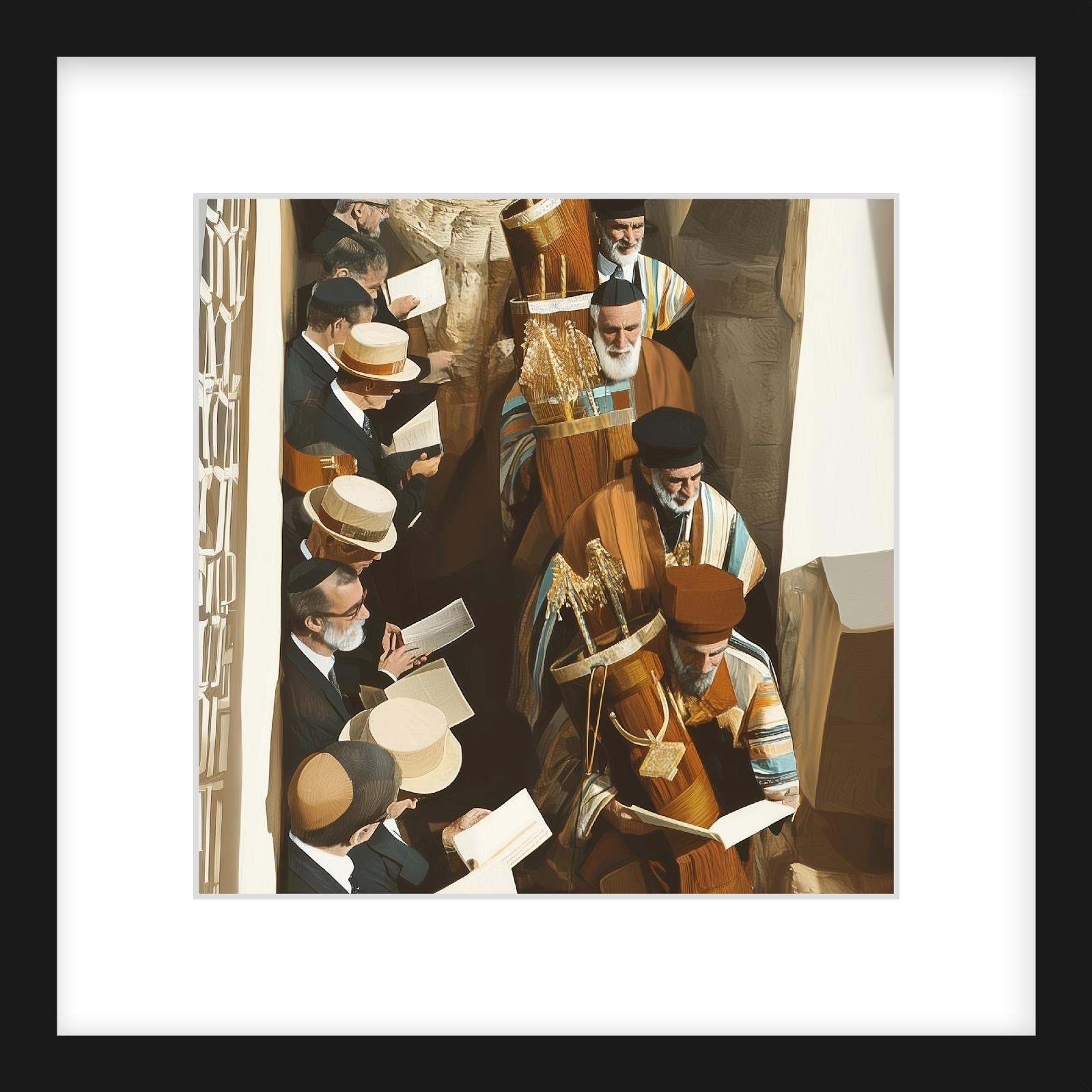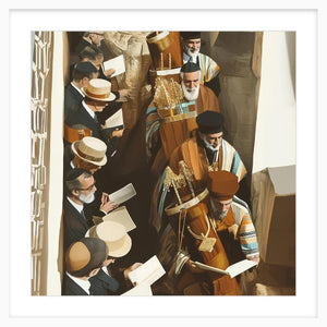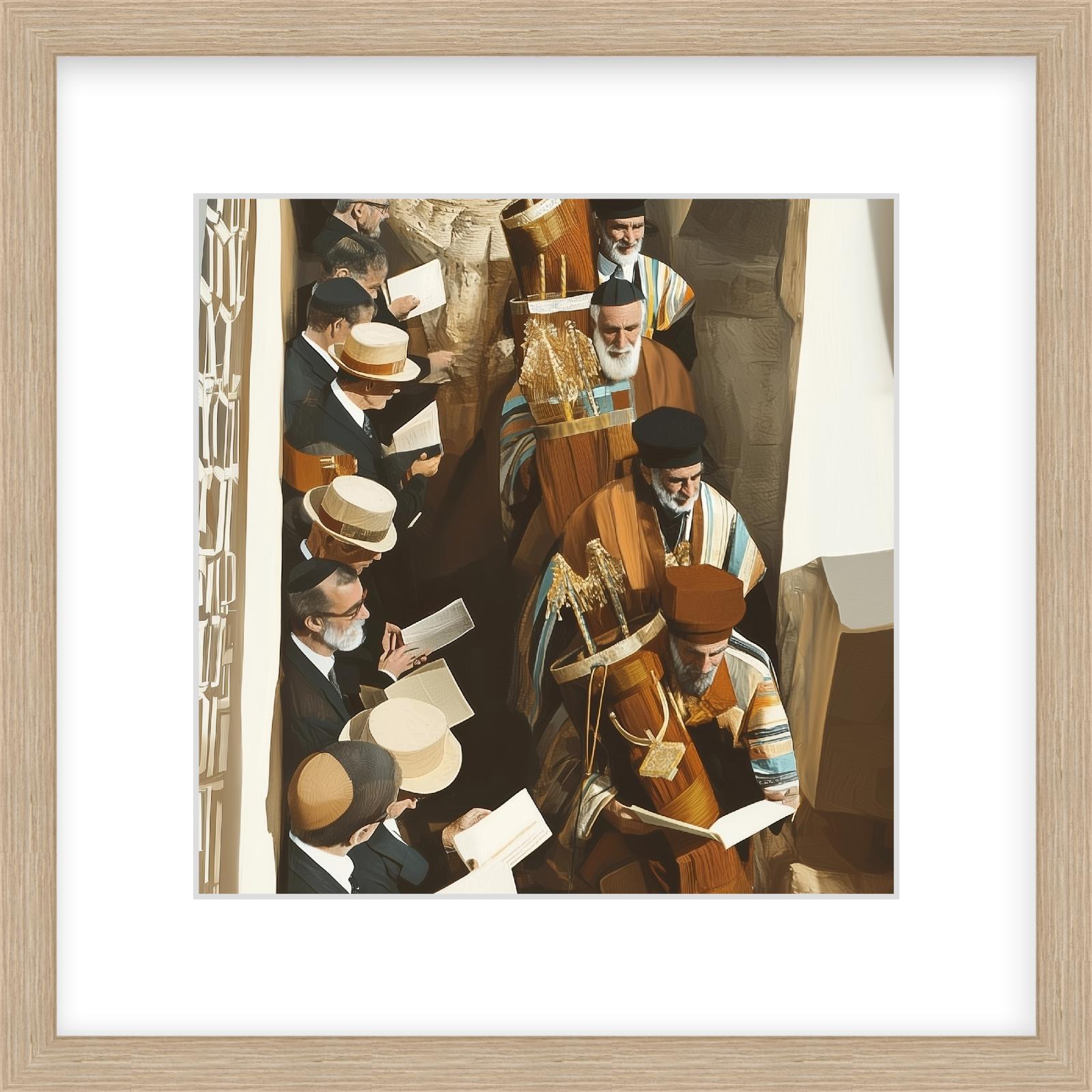 In this beautifully detailed artwork, a procession of Jewish elders moves with quiet dignity, carrying the sacred Torah scrolls. Their golden adornments gleam softly against the warm tones of their robes and the timeworn stone walls behind them. A powerful tribute to Jewish tradition and devotion, Carrying the Torah honours the endurance of spiritual life through generations. This is a moving piece for anyone who cherishes heritage, ritual, and the sacred rhythm of community.