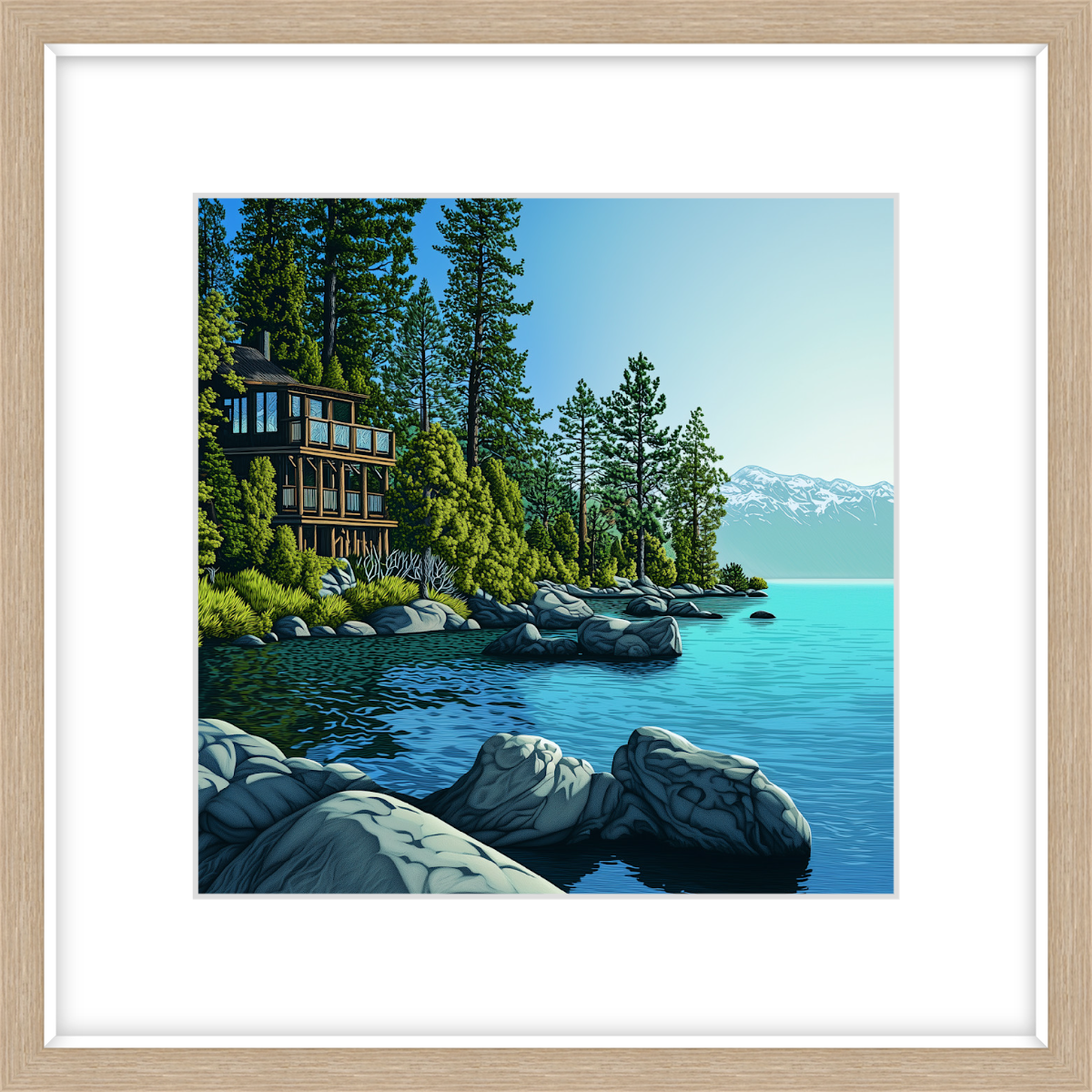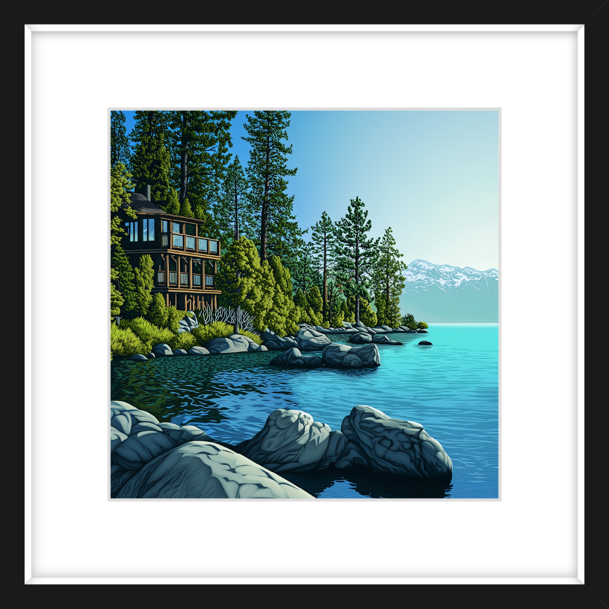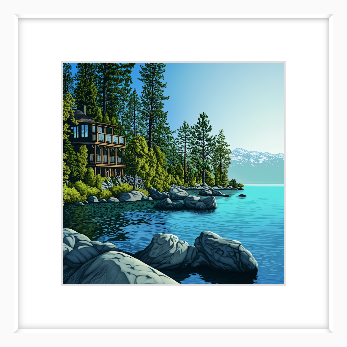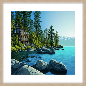 This art print of a Lake Tahoe lakehouse is available as a 250x250mm art print, 400x400mm art print, 600x600mm art print and 800x800mm art print. You may also choose to take the hassle out of framing and order it framed, in either black, white or natural.