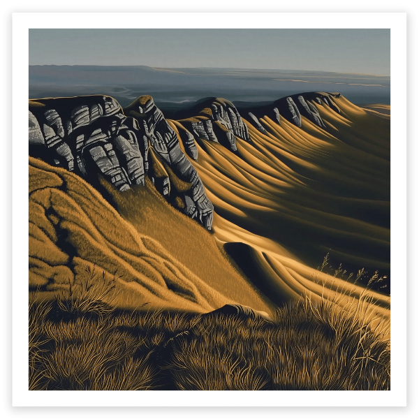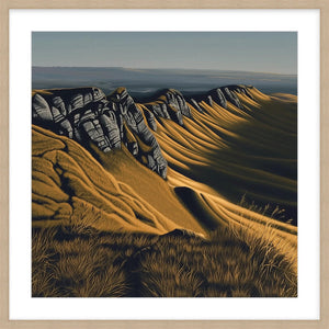 Te Mata explores the sculptural power of the land, its steep ridges folding into deep valleys, their contours softened by shifting light. The artwork captures the drama and permanence of the range, once a stronghold of Māori legend, now standing as a timeless monument to the meeting of myth, geology, and form.