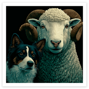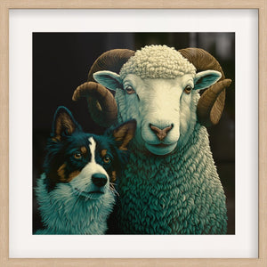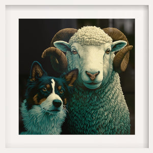 A rare and tender pairing — the loyal farm dog alongside his steadfast ram. Their bond speaks of trust, companionship, and the rhythms of country life, captured with softness and dignity.