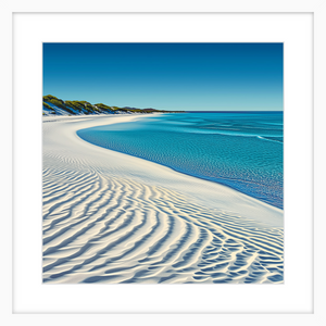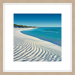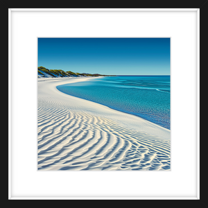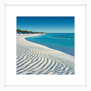 Crystal-clear waters ripple over soft sands and smooth granite boulders in this vibrant depiction of Turquoise Bay. The dynamic lines and shimmering blues draw the eye, creating a serene yet energizing scene that evokes the beauty of Australia's coastal treasures.