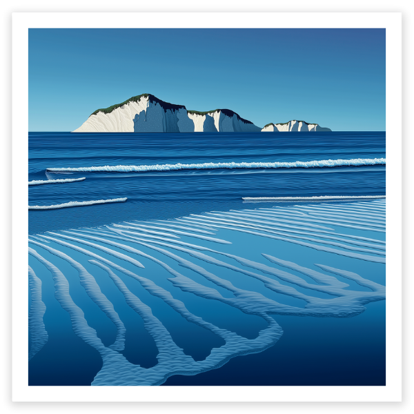 Waimārama is a place of wild, untamed beauty on the Hawke’s Bay coast, the wind, surf, and shifting sands in constant dialogue. The artwork captures the raw energy of the shoreline, with a view out to Bare Island, where isolation and openness create a sense of power and peace.