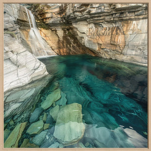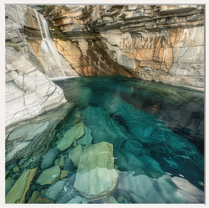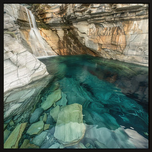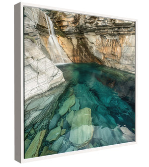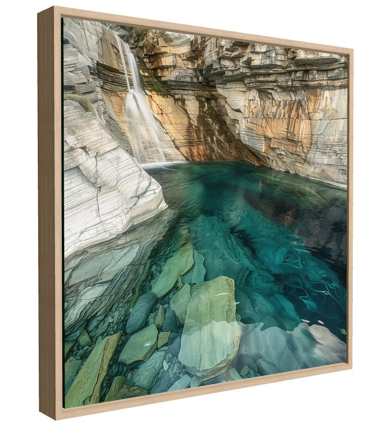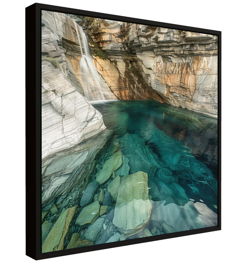 The contrast between the stillness of the water and the gentle fall of the cascade is striking. Amazing on canvas.